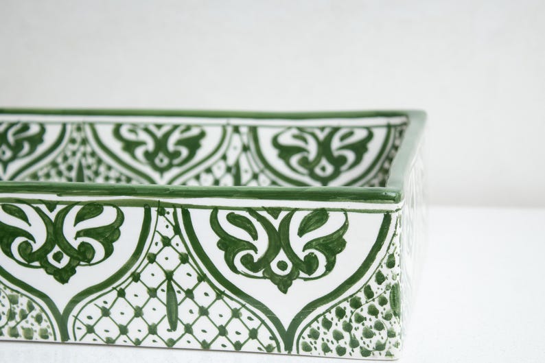 Glazed finish resists water absorption and staining. Regular cleaning maintains the surface. Handcrafted nature means each piece carries subtle variations in pattern application.