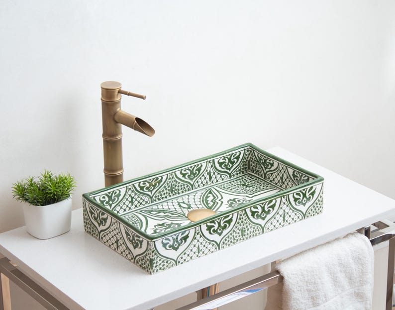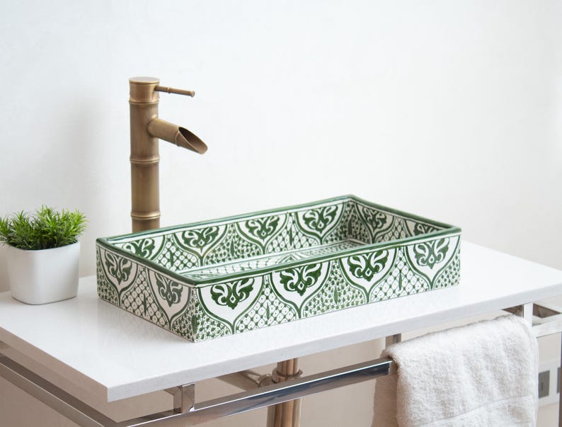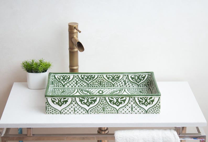 Handpainted Green Floral Ceramic Basin: Rectangular Vessel Sink