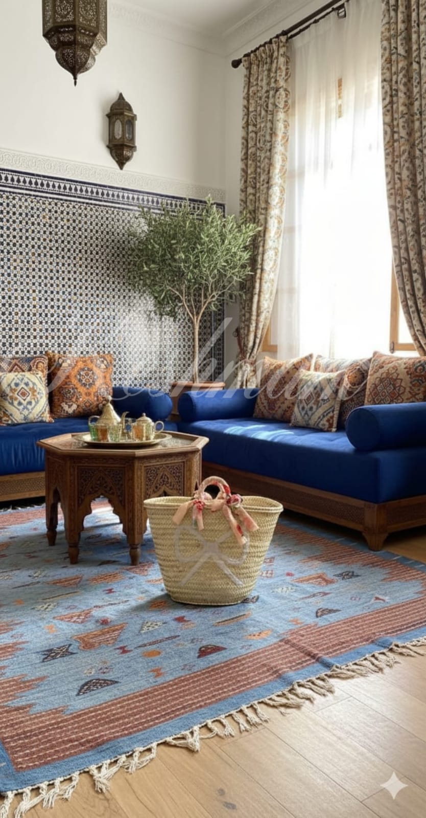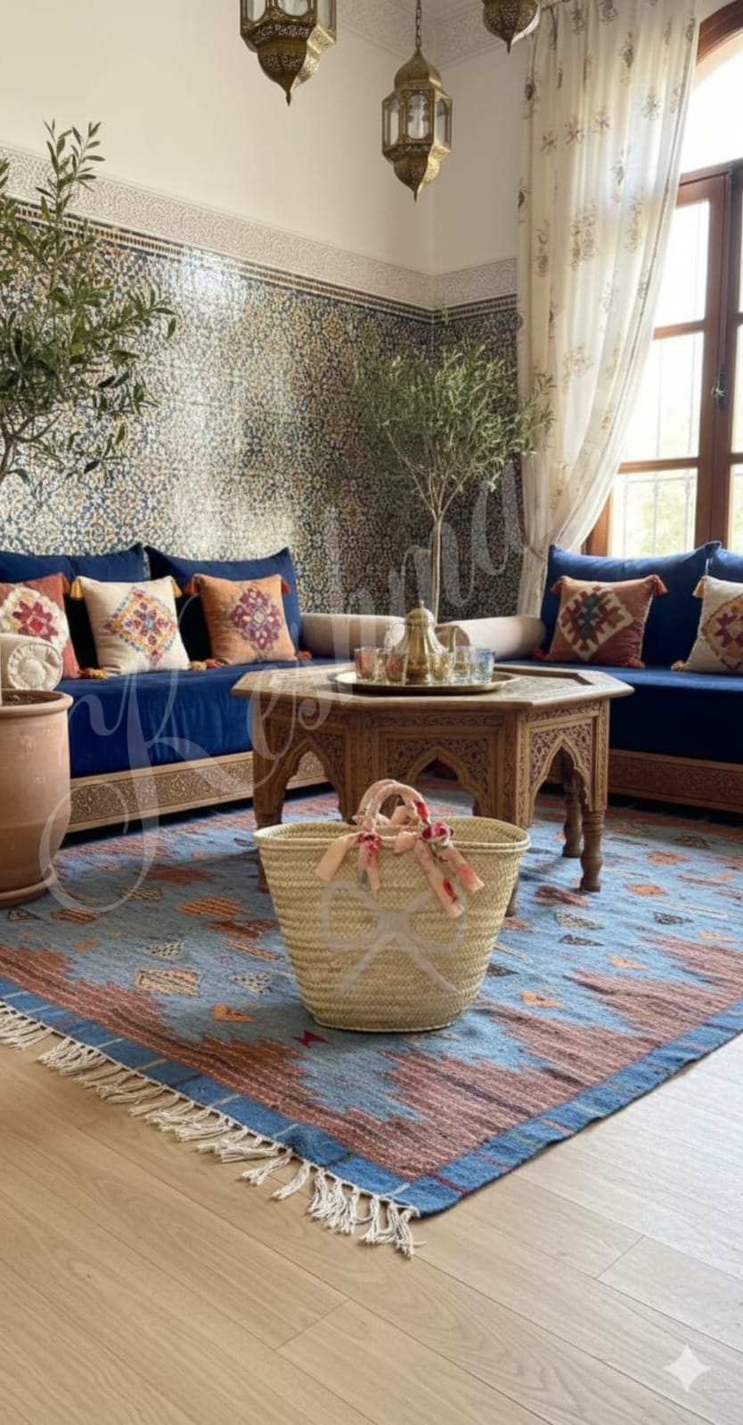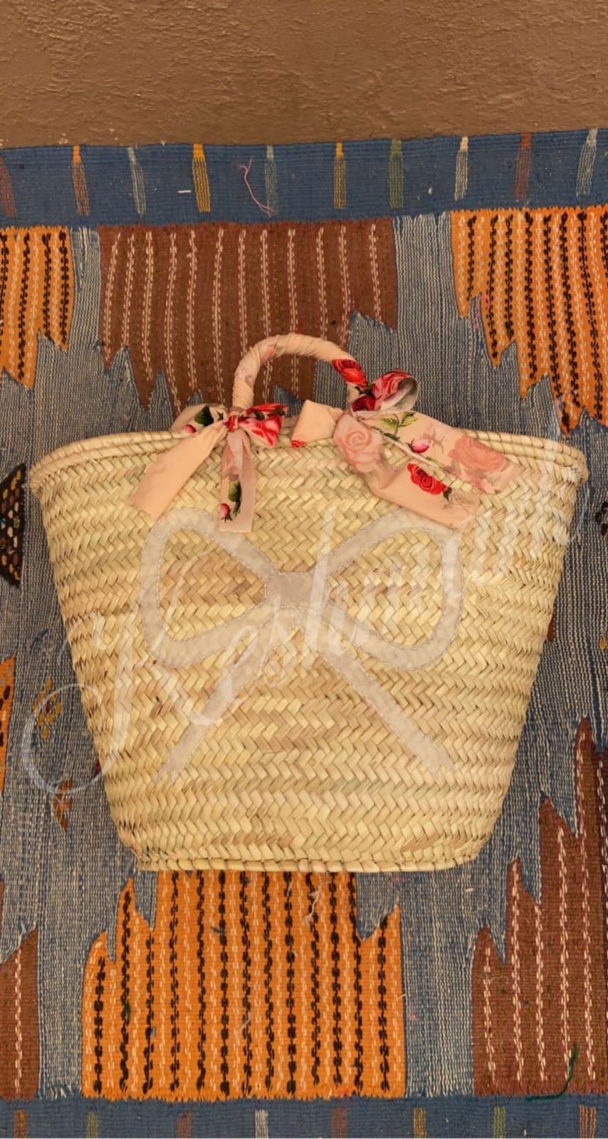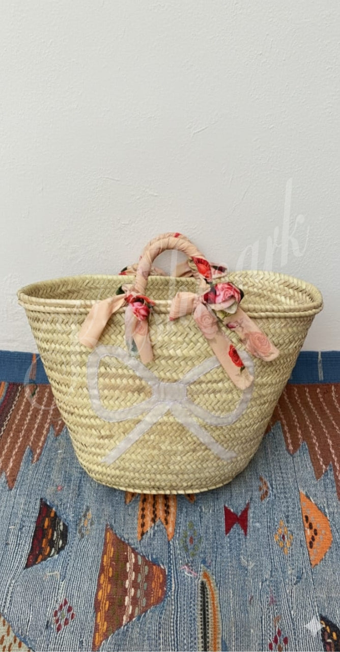 This charming Moroccan straw basket is handwoven from natural palm leaves and decorated with a white bow and floral ribbon handles. Lightweight, durable, and eco-friendly — perfect for the beach, market, or everyday use. Each piece is handmade by skilled artisans in Marrakech, giving every bag its own unique character.