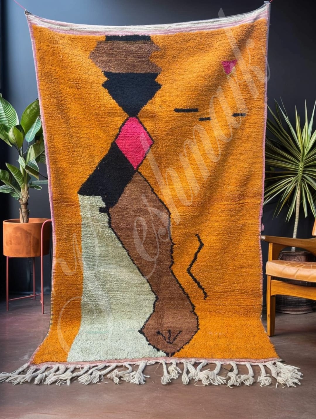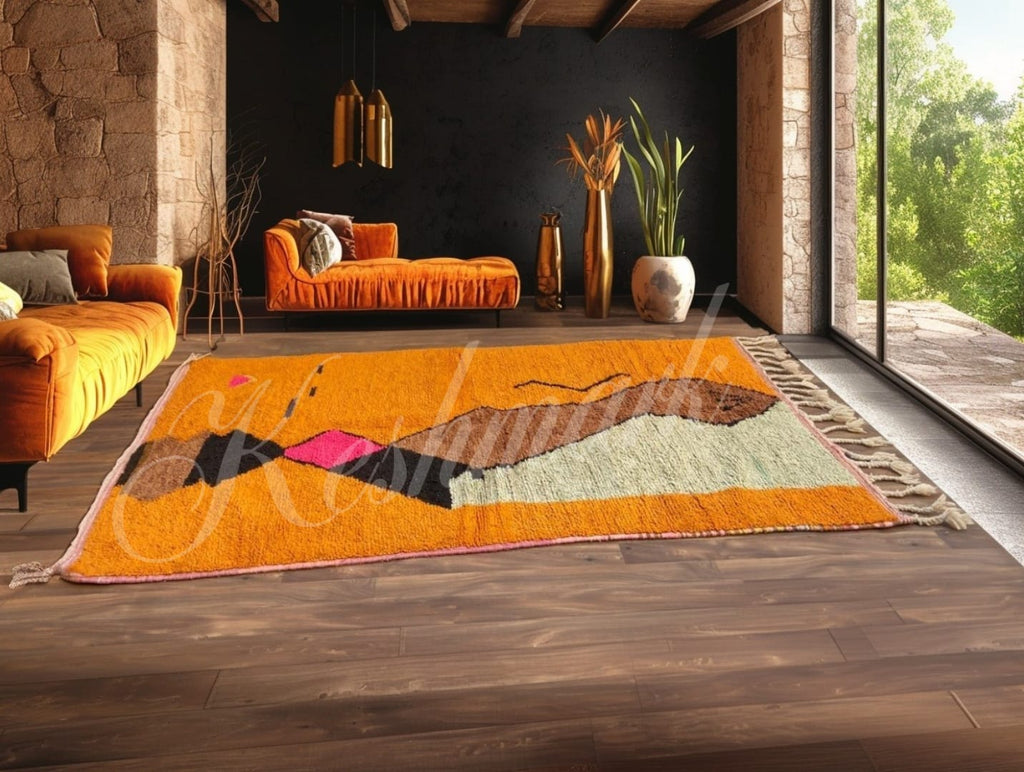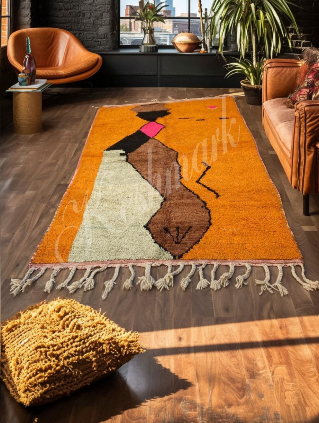 This exceptional Handmade Moroccan Wool Rug is a masterpiece of modern Berber design — a perfect fusion of art, tradition, and bold color. Handwoven by skilled women artisans in the Atlas Mountains, it showcases a striking abstract geometric pattern with hues of burnt orange, camel brown, soft mint, deep black, and fuchsia pink.