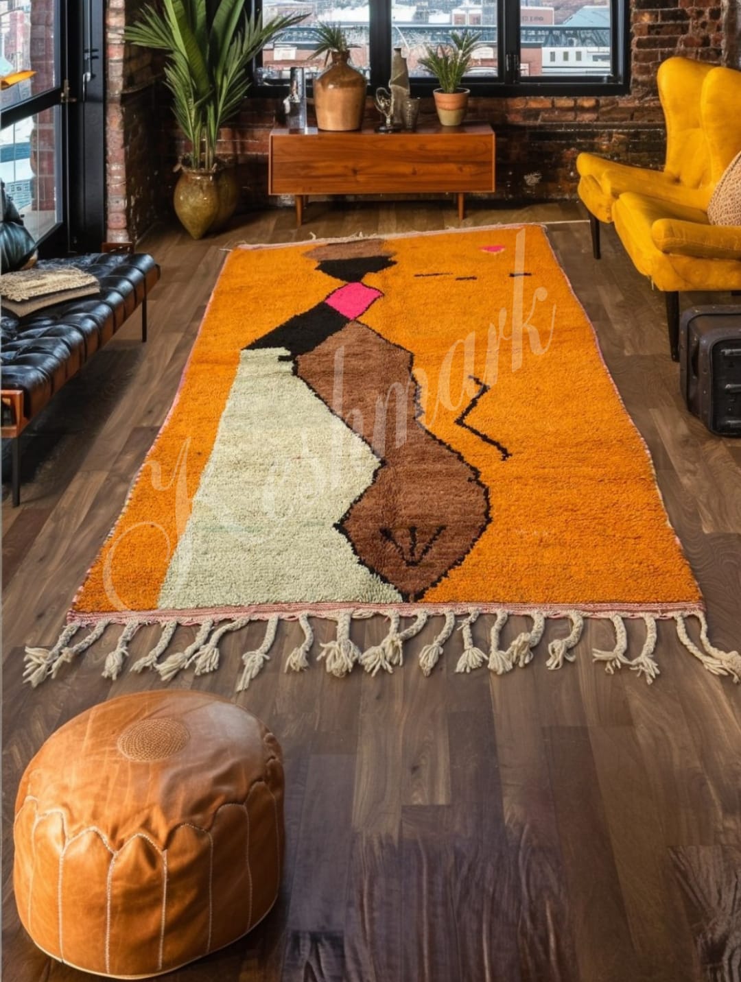 Handmade Moroccan Wool Rug – Abstract Modern Berber Carpet, Orange Brown Black and Pink Wool Area Rug, Boho Rug