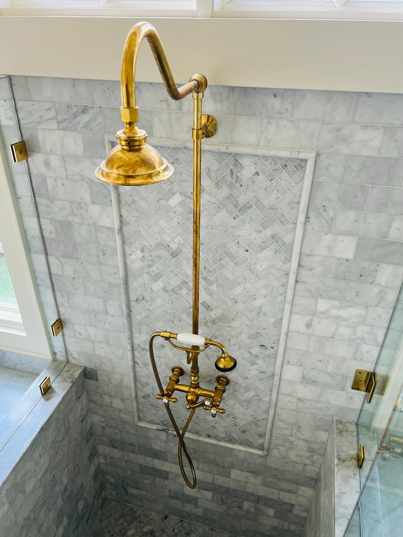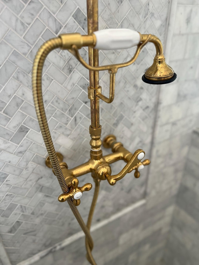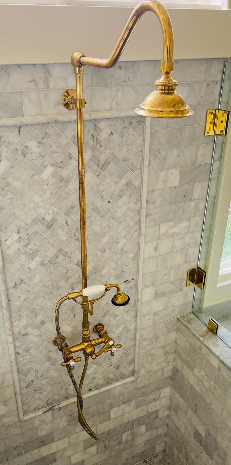 Featuring solid brass construction our exposed shower system is incredible. A perfect polish gives way to the perfect patina. Unlacquered to age gracefully with time.