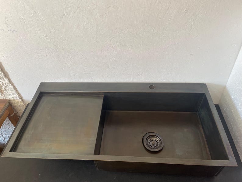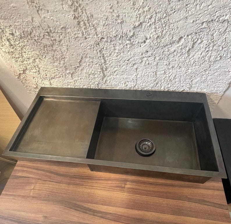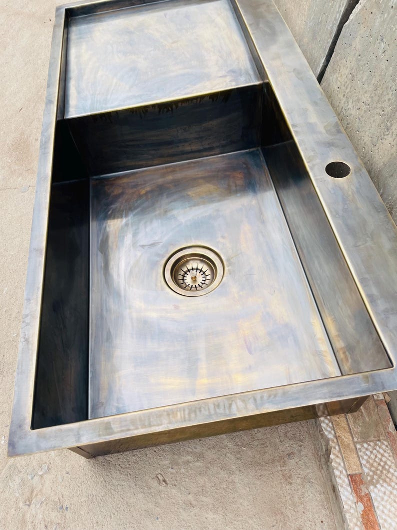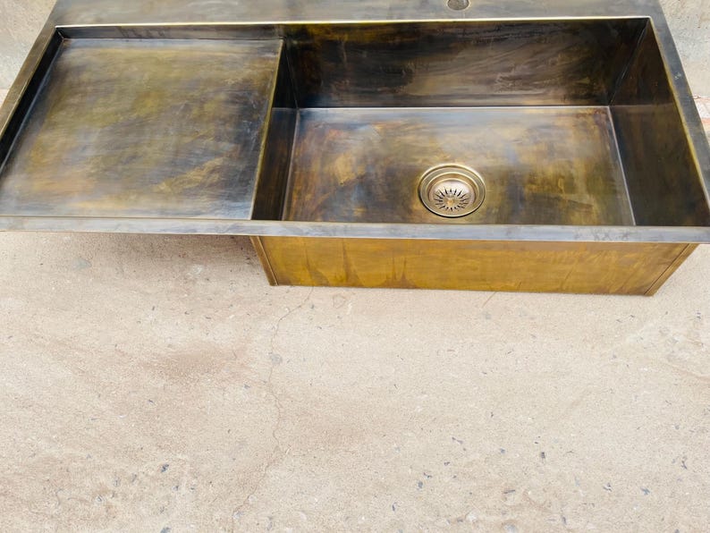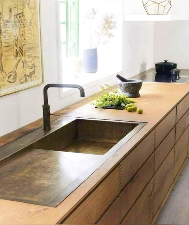 Bring a bold, architectural look to your kitchen with this integrated brass sink with drainboard. Designed as a full countertop-style sink surface, it combines the basin and draining/work area into one clean, seamless statement—ideal for modern and minimalist kitchens.
