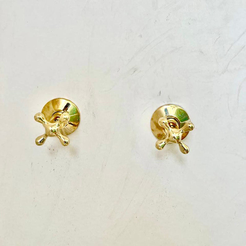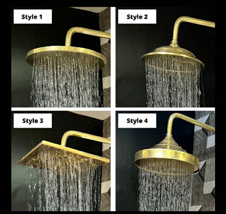 Statement wall-mounted rain shower made from solid brass with a wide rainfall shower head and matching 2-handle controls for hot/cold water. Clean vintage look with a spa-style rain flow—perfect for luxury bathrooms. Custom head size, arm length, and finishes available on request.