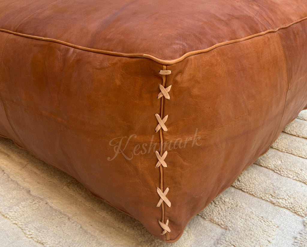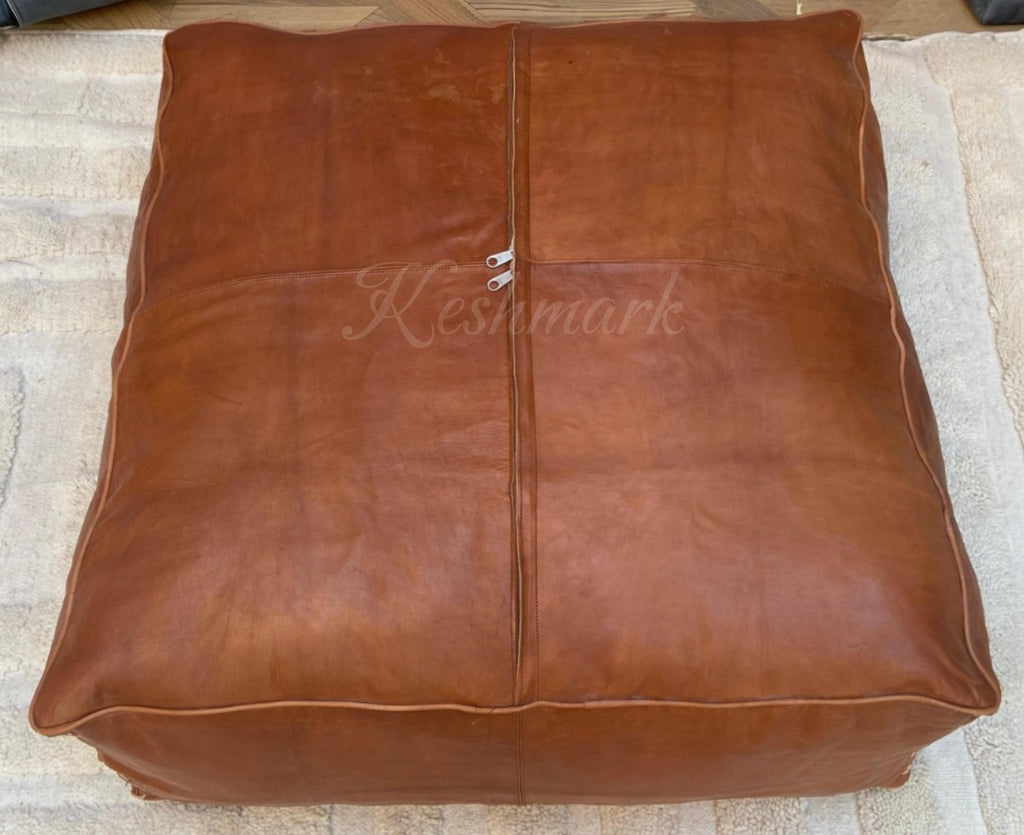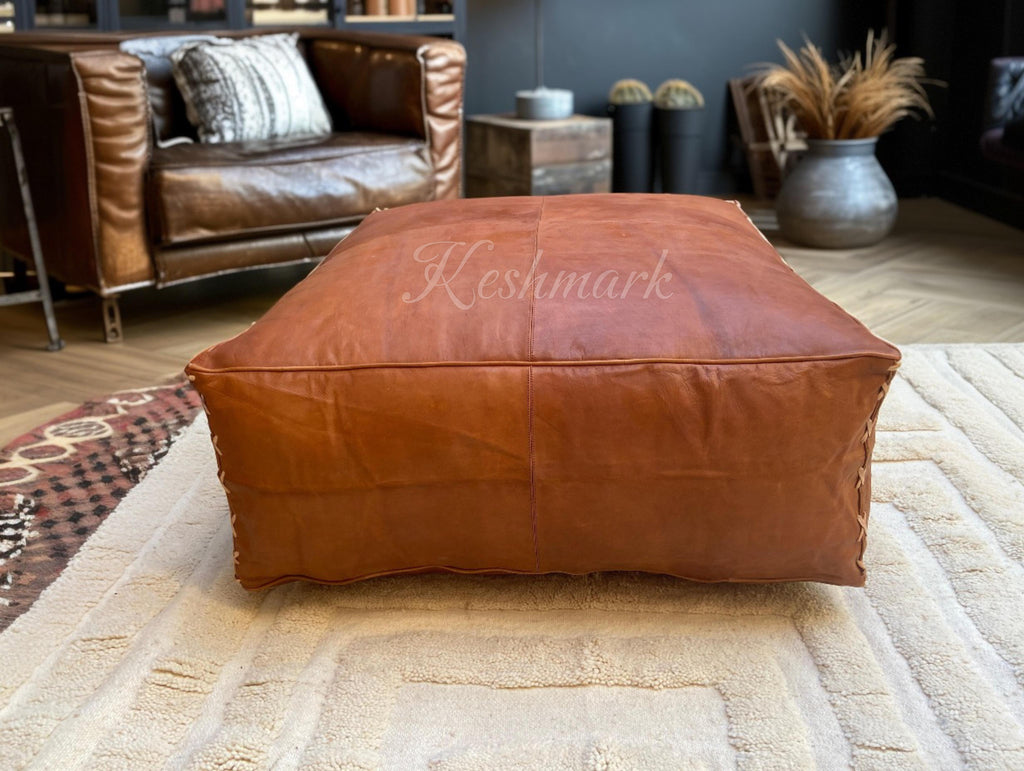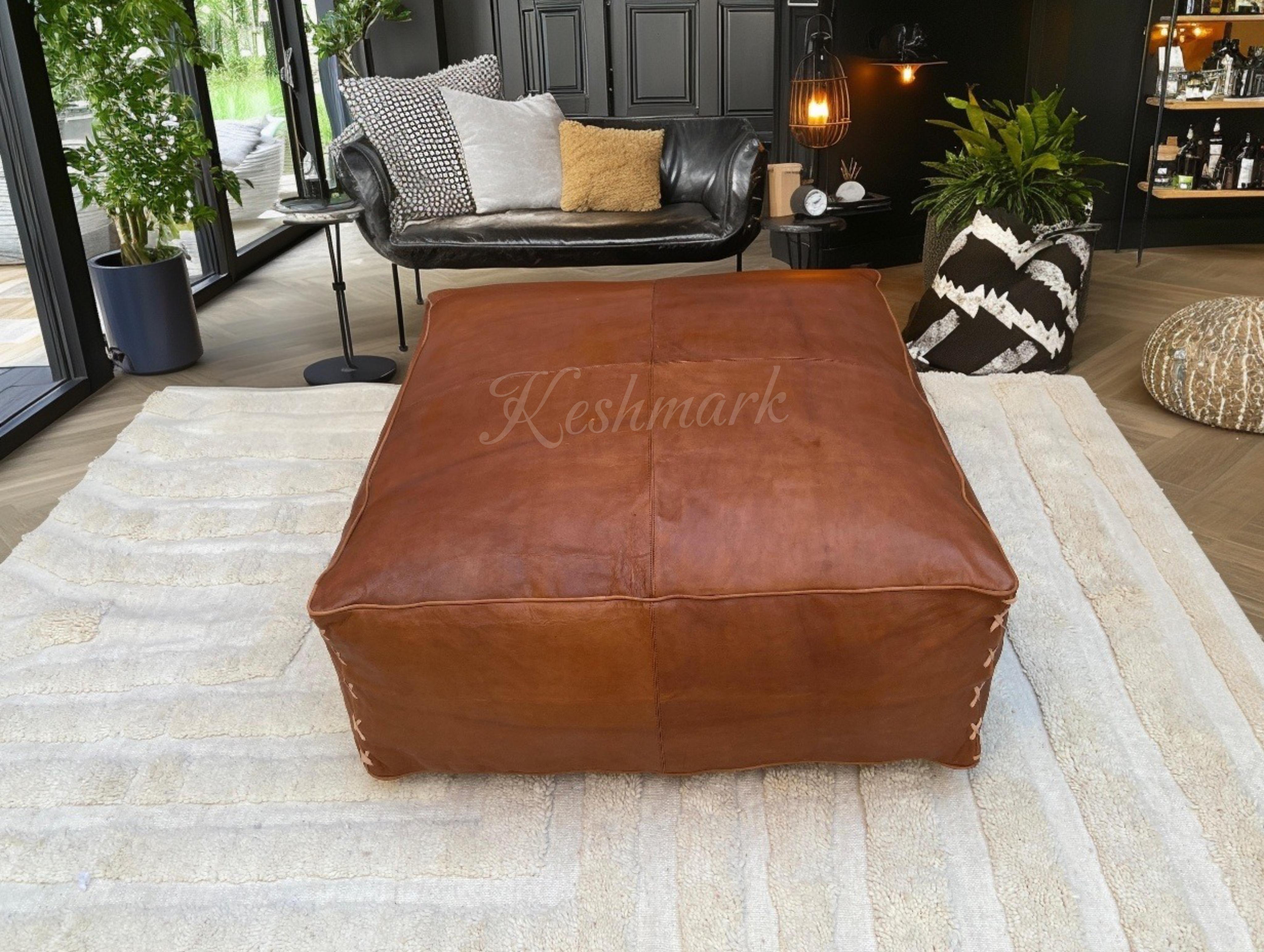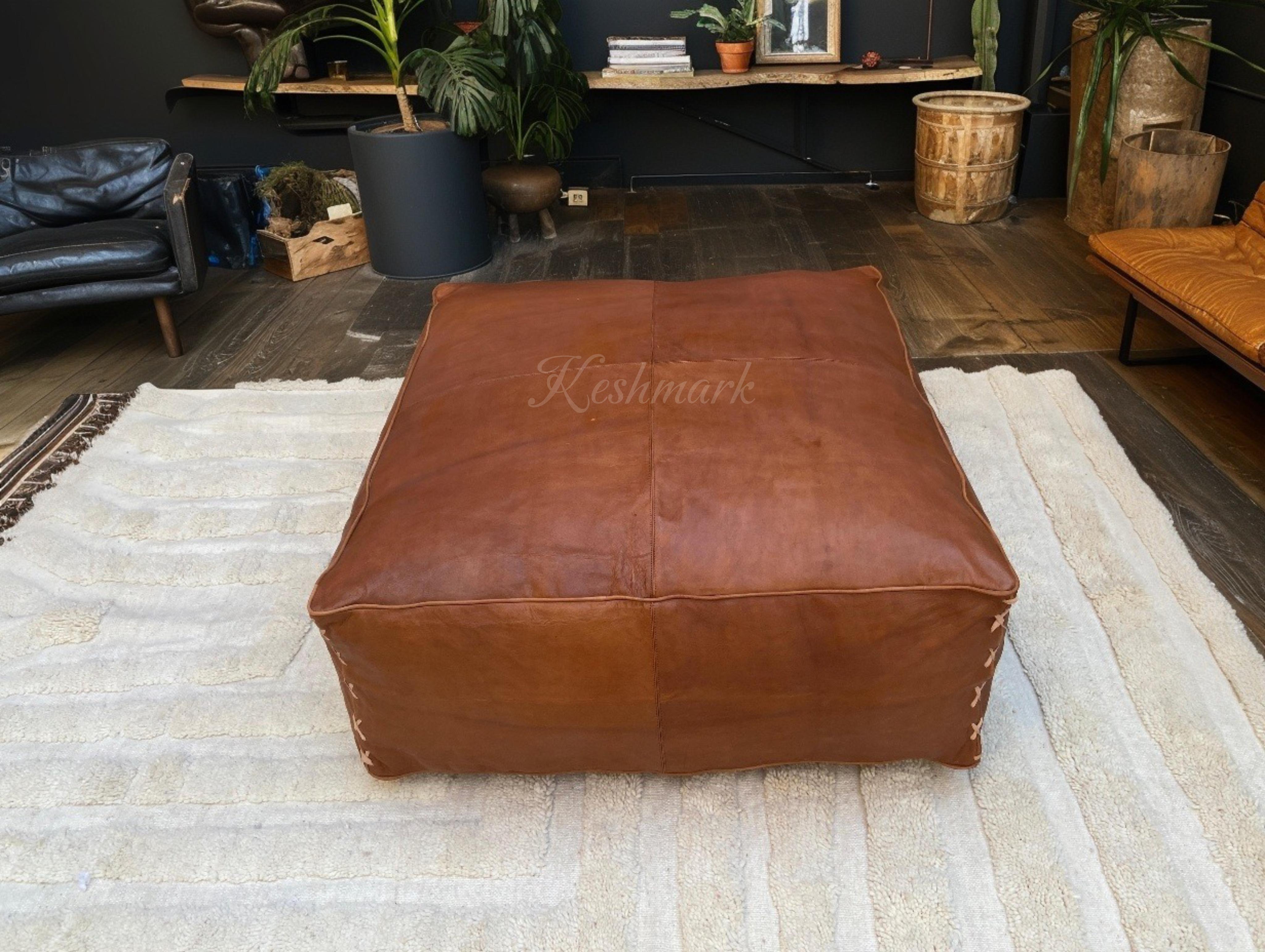 Large Handmade Leather Pouf – 35x35x14 Inches Moroccan Ottoman, Natural Brown Square Floor Cushion, Genuine Leather Footstool, Boho Home Decor