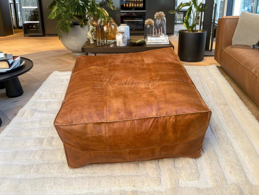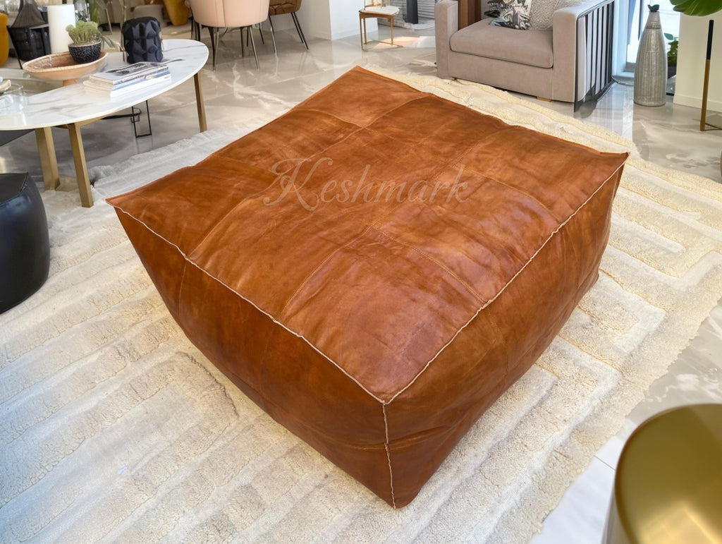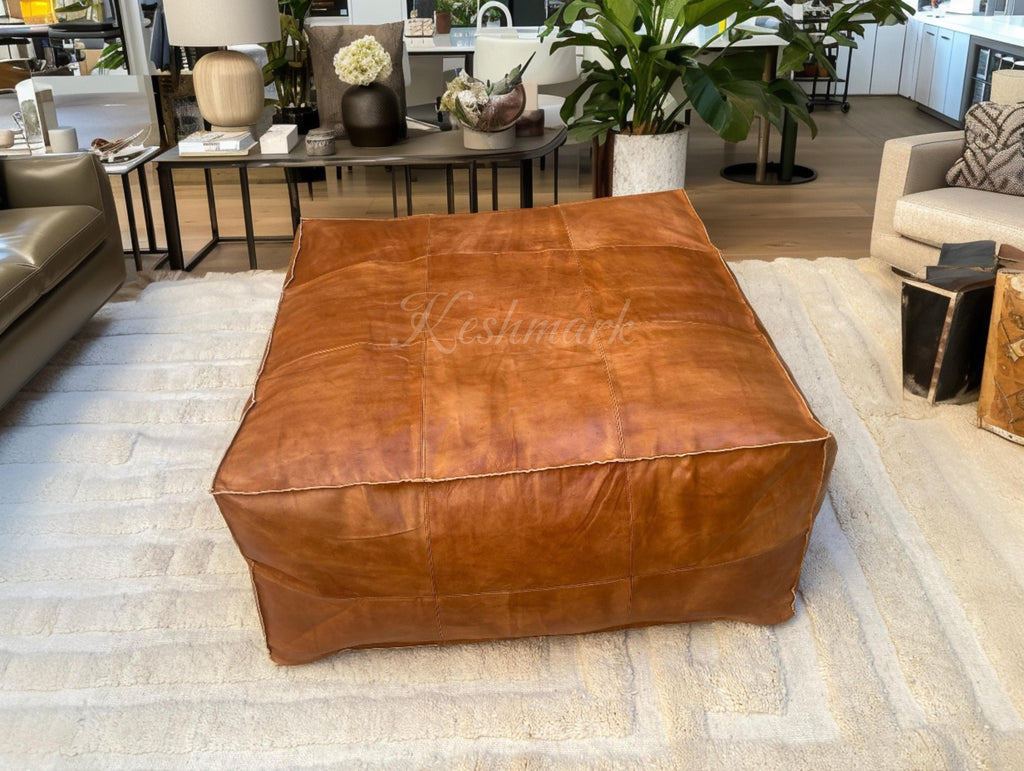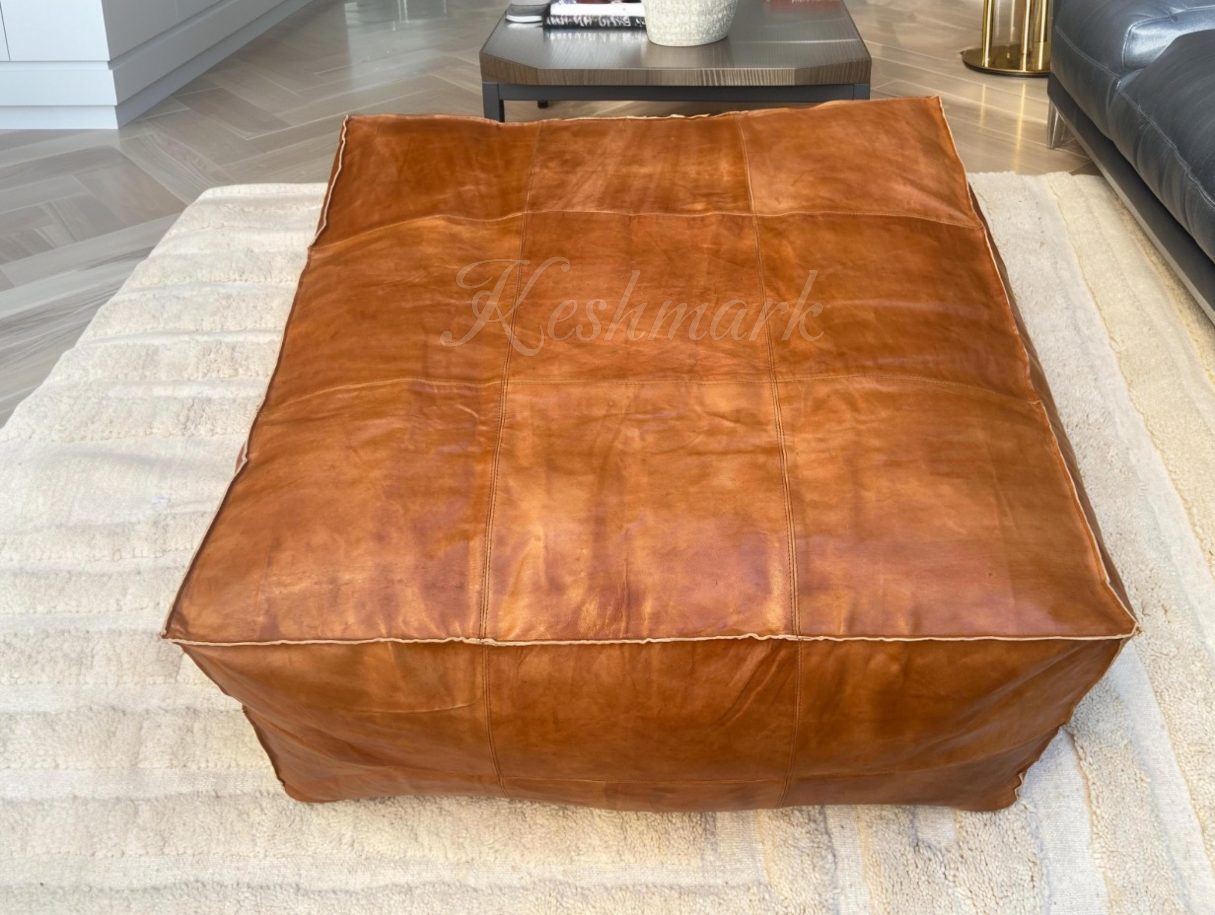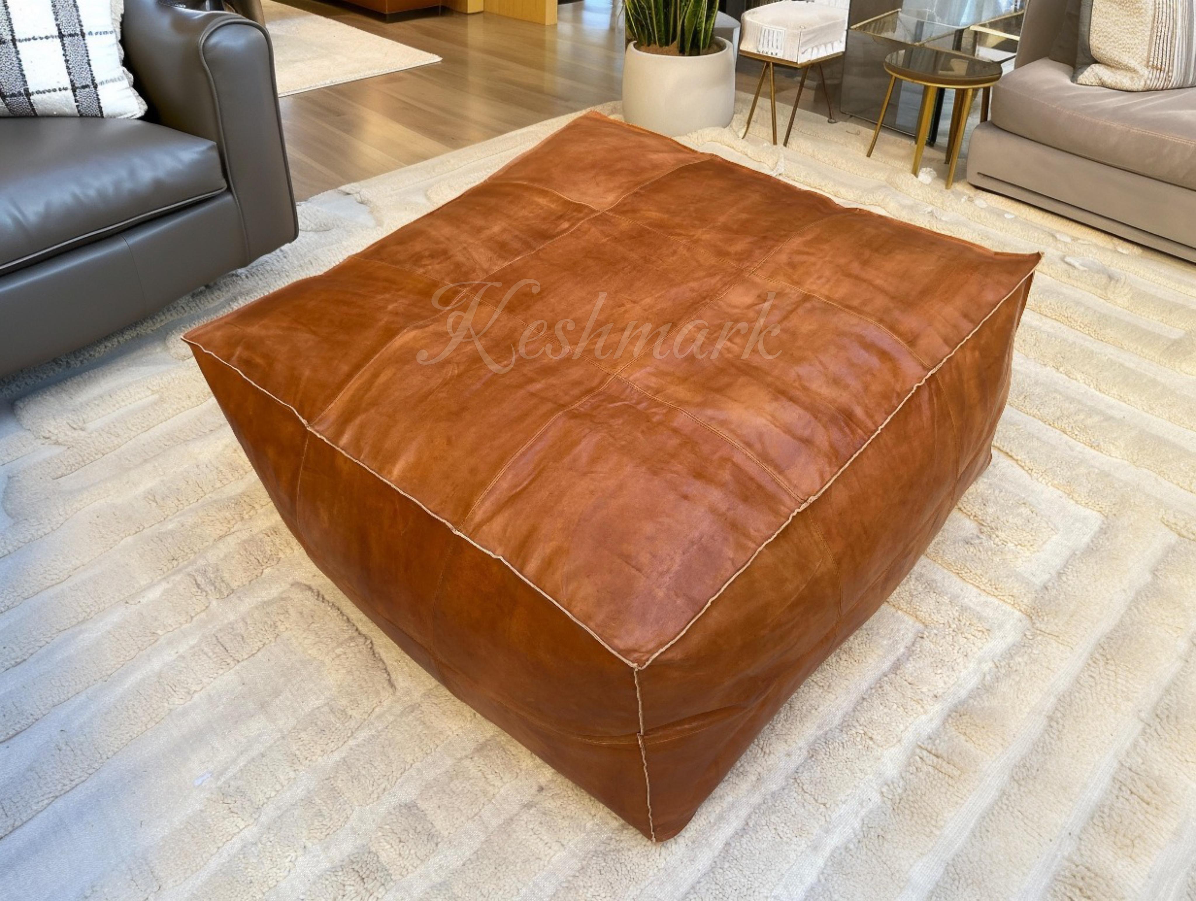 Large Handmade Leather Pouf – 40x40x18 Inches Square Moroccan Ottoman, Genuine Natural Brown Leather Floor Cushion, Boho Living Room Decor
