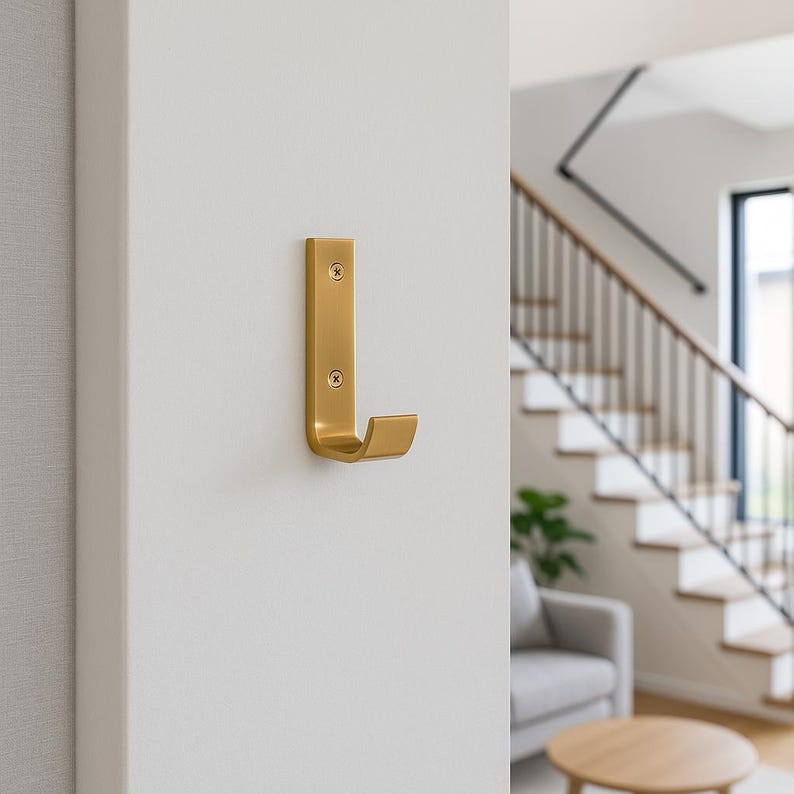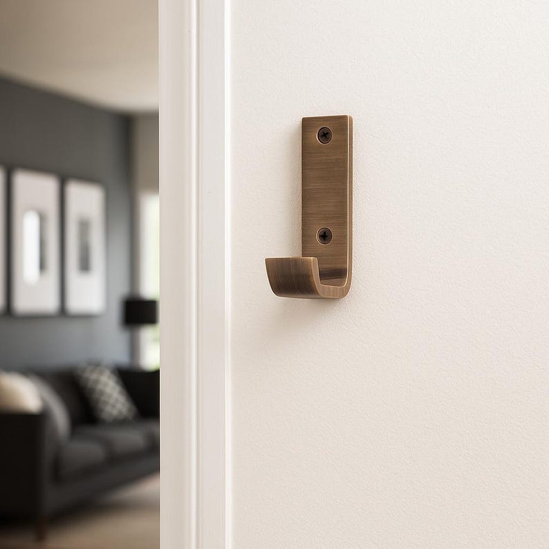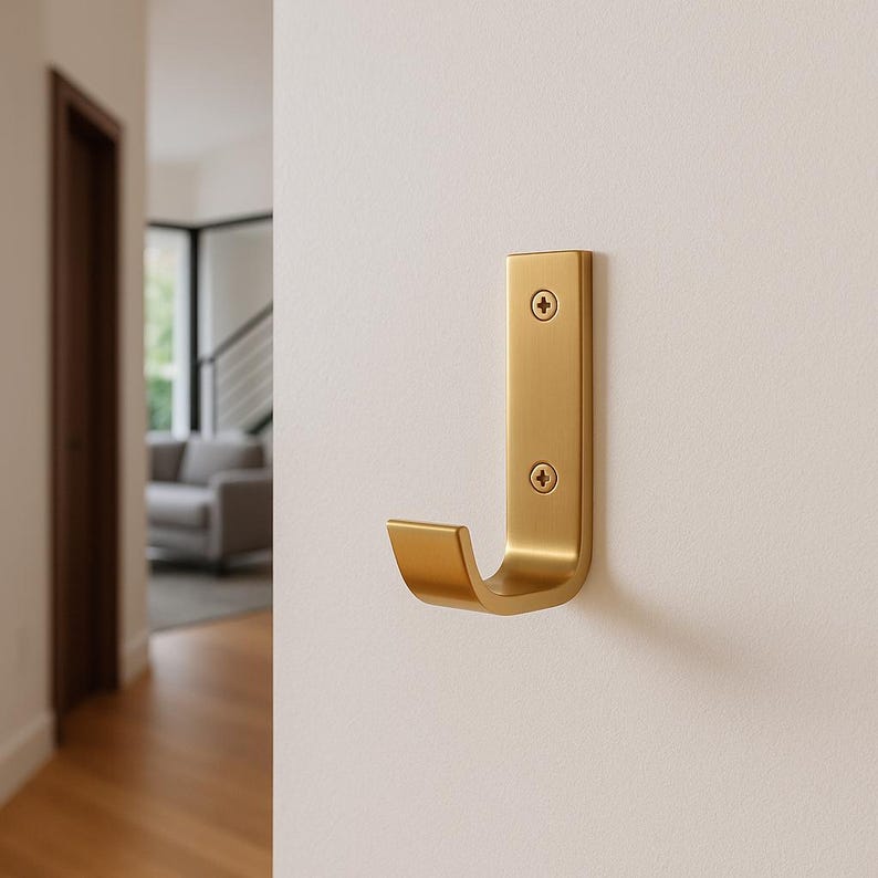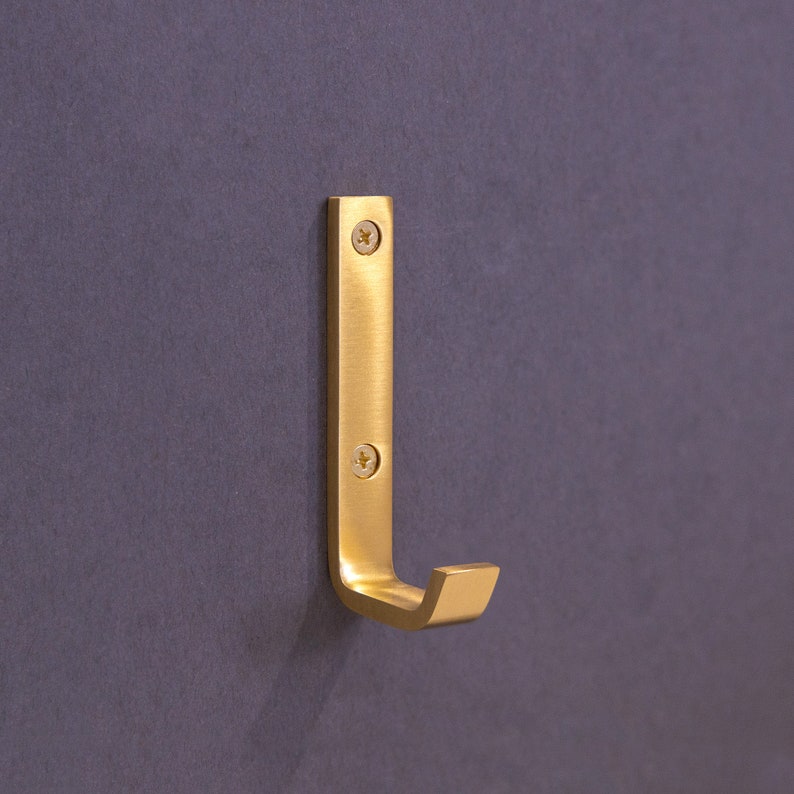 The Leon brass towel hook adds design and functionality to your walls. Crafted from solid brass, this sturdy hook is built to support all your hanging needs The modern design is timeless and complements your home design elements seamlessly. The brushed brass gold finish adds a touch of elegance, reflecting a soft gold glow that catches the surrounding light beautifully. Order yours today and elevate your space!