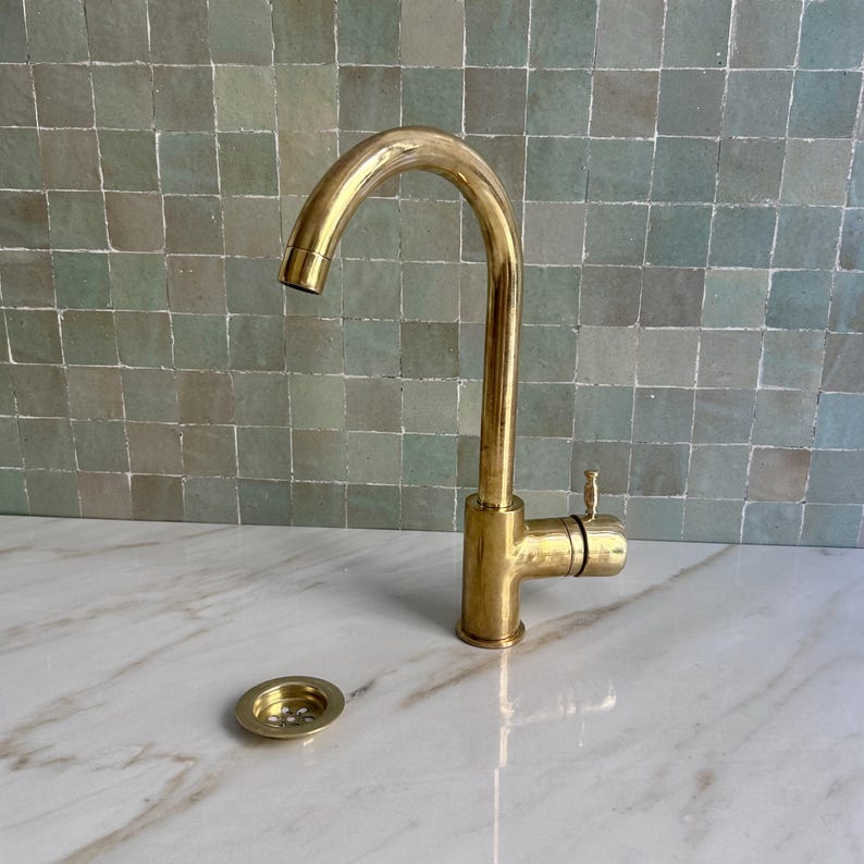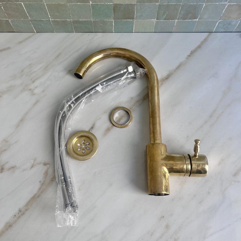 modern brass faucet • single handle brass tap • handmade vessel sink faucet • Moroccan brassware • minimalist bathroom fixture • vanity faucet with drain • golden brass faucet set • boho chic bathroom upgrade • contemporary bathroom tap • artisan brass spout • solid brass plumbing fixture