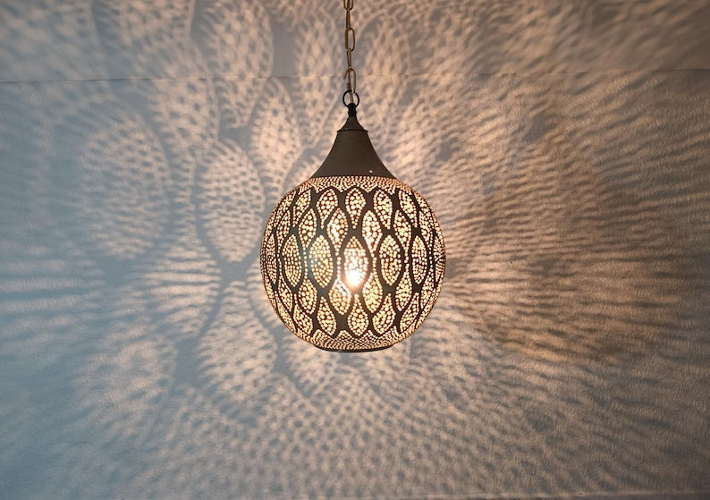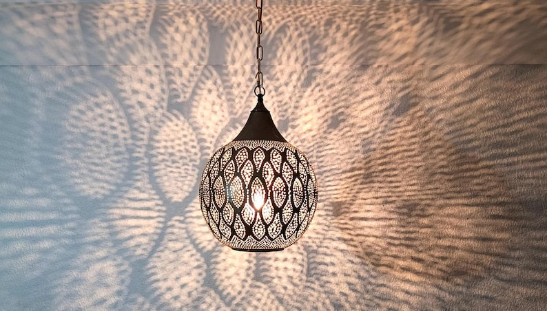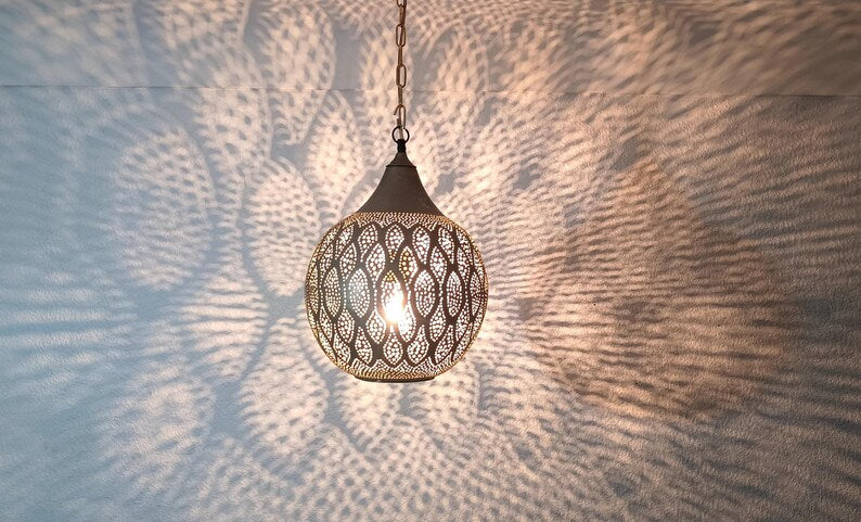 Simple Moroccan pendant lamp. A stunning Moroccan style hand-made ceiling light fixture- a pendant lamp is designed to enhance the exotic beauty of your home decor. Exclusive custom lighting designs from Arabian Home Décor will ensure that this Moroccan piece of art will complement your existing décor and completely enhance the ambiance by filling in the portion of darkness while leaving the remaining area soothing