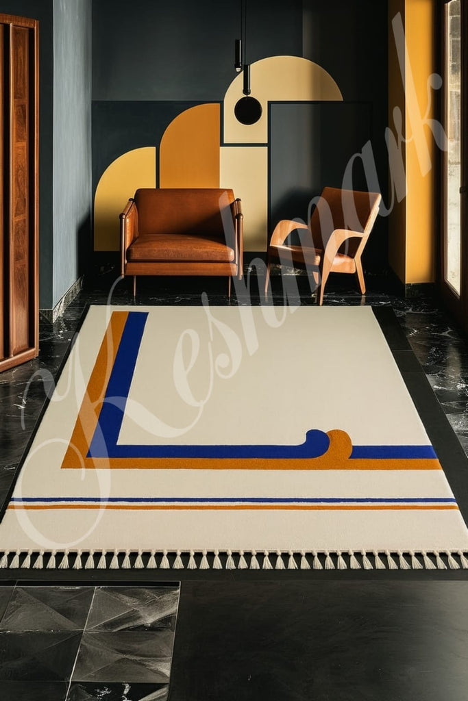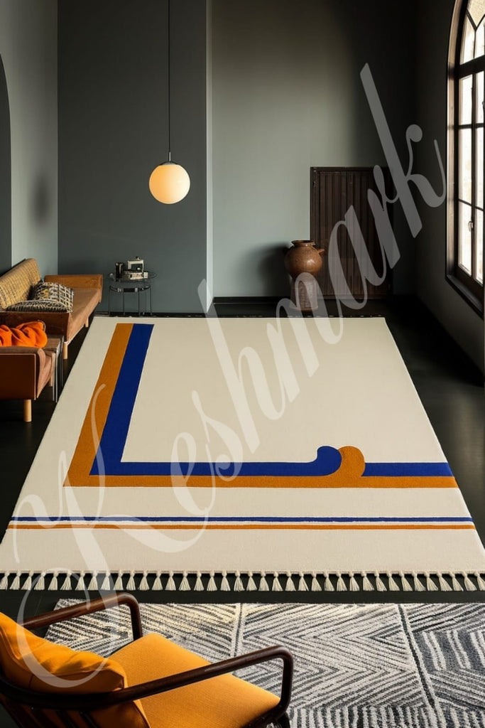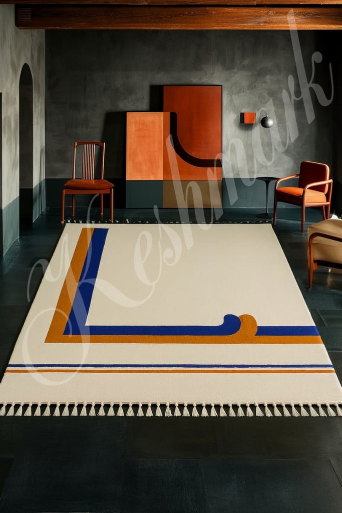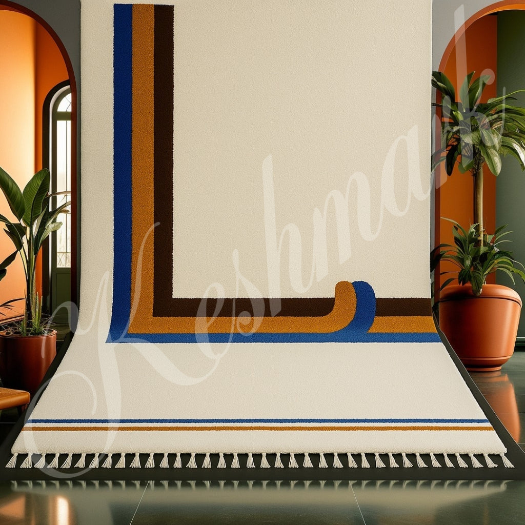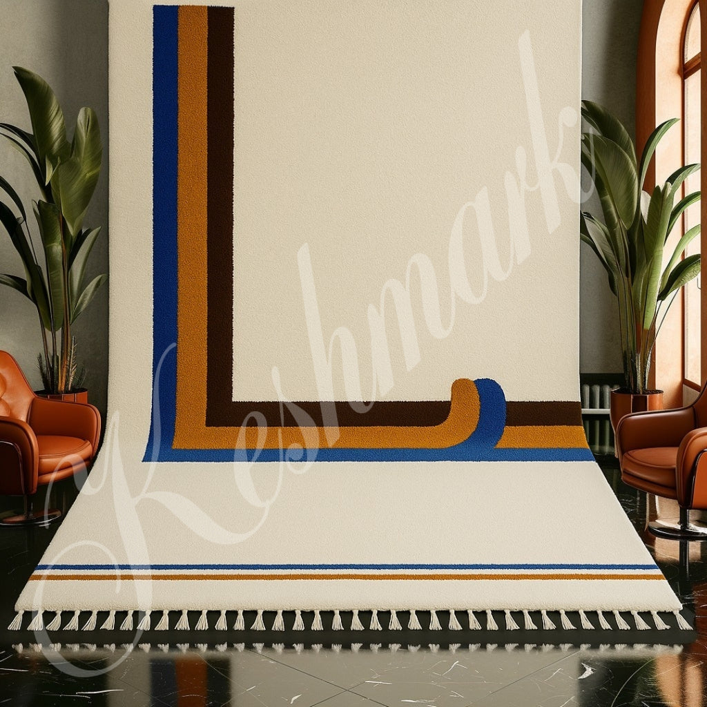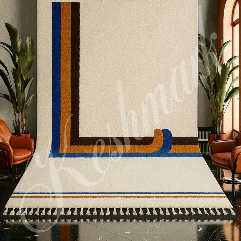 Carefully handcrafted, the rug adds warmth, style, and artisan character to living rooms, bedrooms, studios, and contemporary interiors. Its elegant border detailing and subtle curved motifs make it an eye-catching centerpiece for any home.