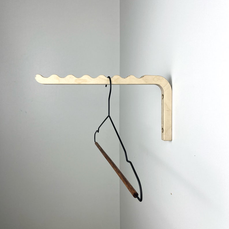 Introducing our versatile wall mount clothes hanger rack, a practical solution for your storage needs. Crafted with durable plywood, this t-shirt hanger is perfect for your closet or laundry room. Its simple minimalist design adds style to any space, from your entryway to your office. With its valet hook for the wall, this Brass rack keeps your clothes organized and easily accessible. Say goodbye to clutter and hello to convenience with this unique closet storage rack!