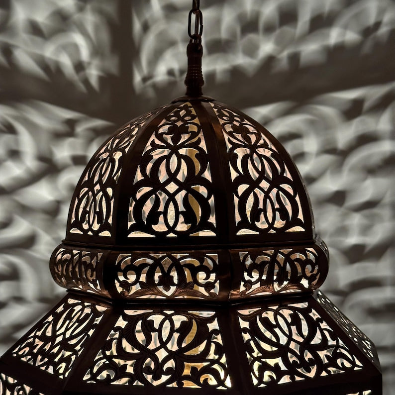 Each Moroccan brass lamp we offer, whether a pendant, wall, table, or floor lamp, is crafted from high-quality solid brass using centuries-old metalworking techniques. Our pierced designs project mesmerizing patterns across walls and ceilings, creating a warm, ambient glow. With multiple finish options (Gold, Bronze, Black, Silver, Copper) and a range of sizes, our handcrafted lights offer endless versatility to fit any décor, from modern boho to rustic or classic interiors.