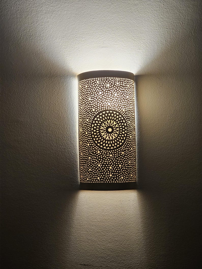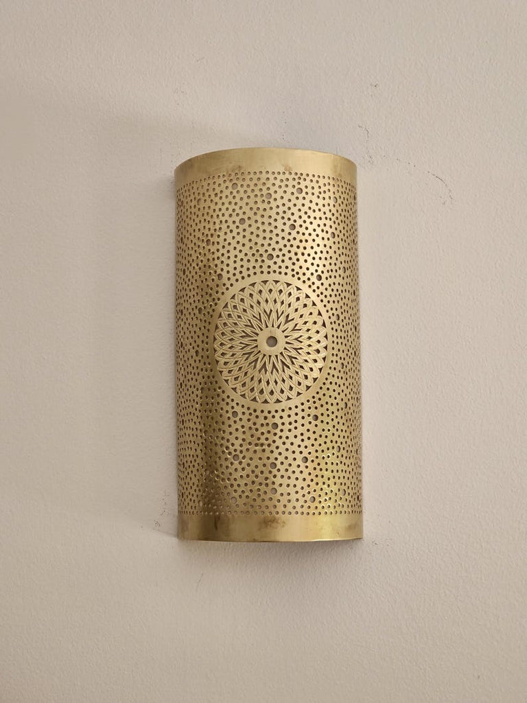 This brass wall sconce, made in Morocco, combines traditional craftsmanship with modern design. Its refinement is reflected in its clean lines and flawless finish, adding a touch of sophistication to any space. A must-have for lovers of intricate craftsmanship and global-inspired design. Bring the allure of Morocco into your home with this stunning brass wall sconce!