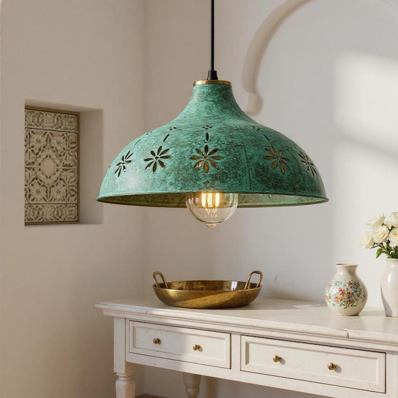Add warmth, artistry, and character to your space with this handcrafted green patina brass pendant light, featuring a charming floral cut-out design that transforms your lighting into a stunning decorative statement. Each piece is carefully crafted by Moroccan artisans using traditional metalworking techniques, ensuring a unique and timeless addition to your interior.