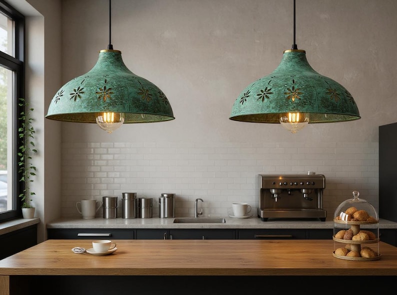โจ The rich contrast between the polished copper base and the oxidized green patina top adds character and depth to the lamp, casting a warm, elegant glow. Ideal for kitchen islands, dining rooms, cafes, or entryways.