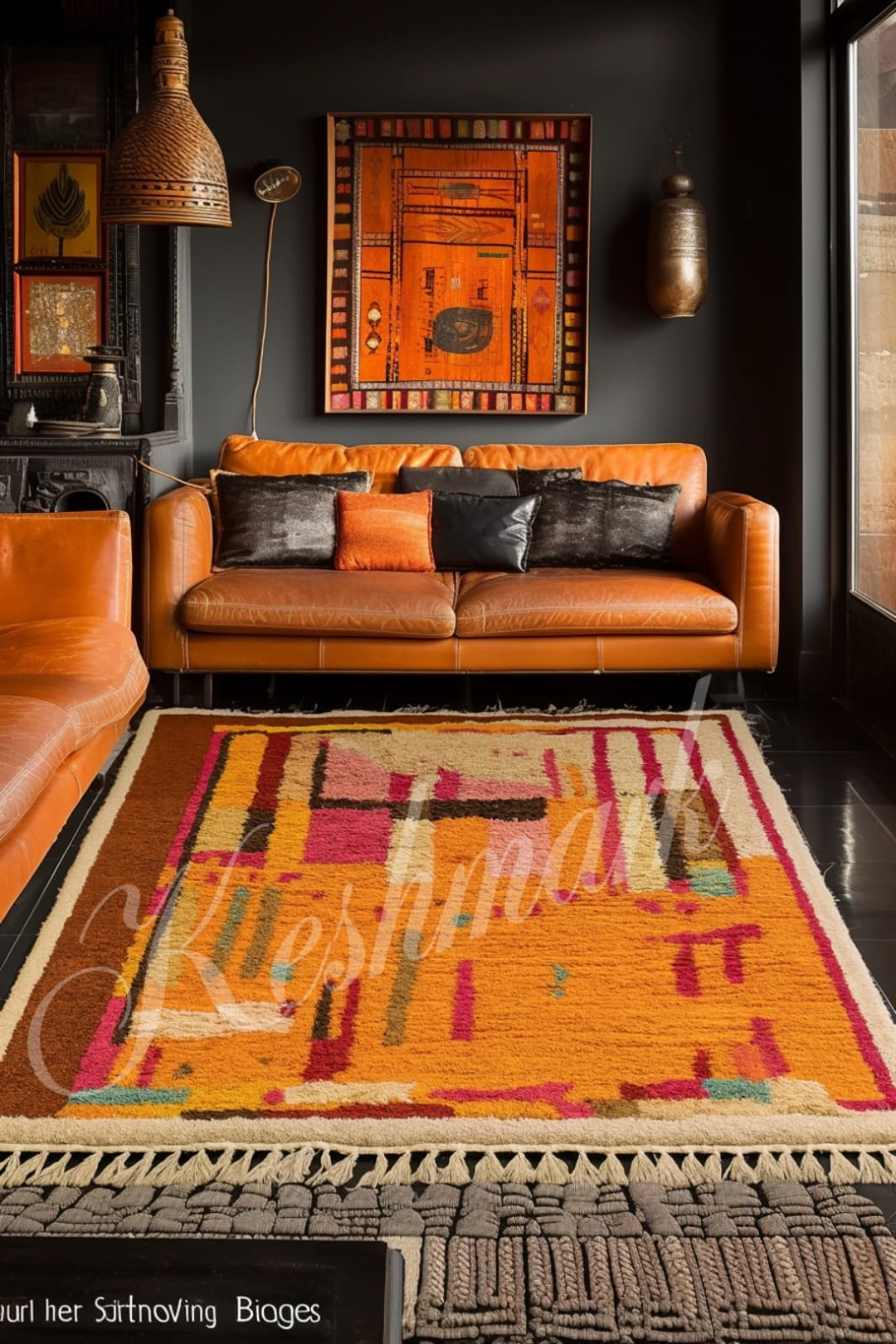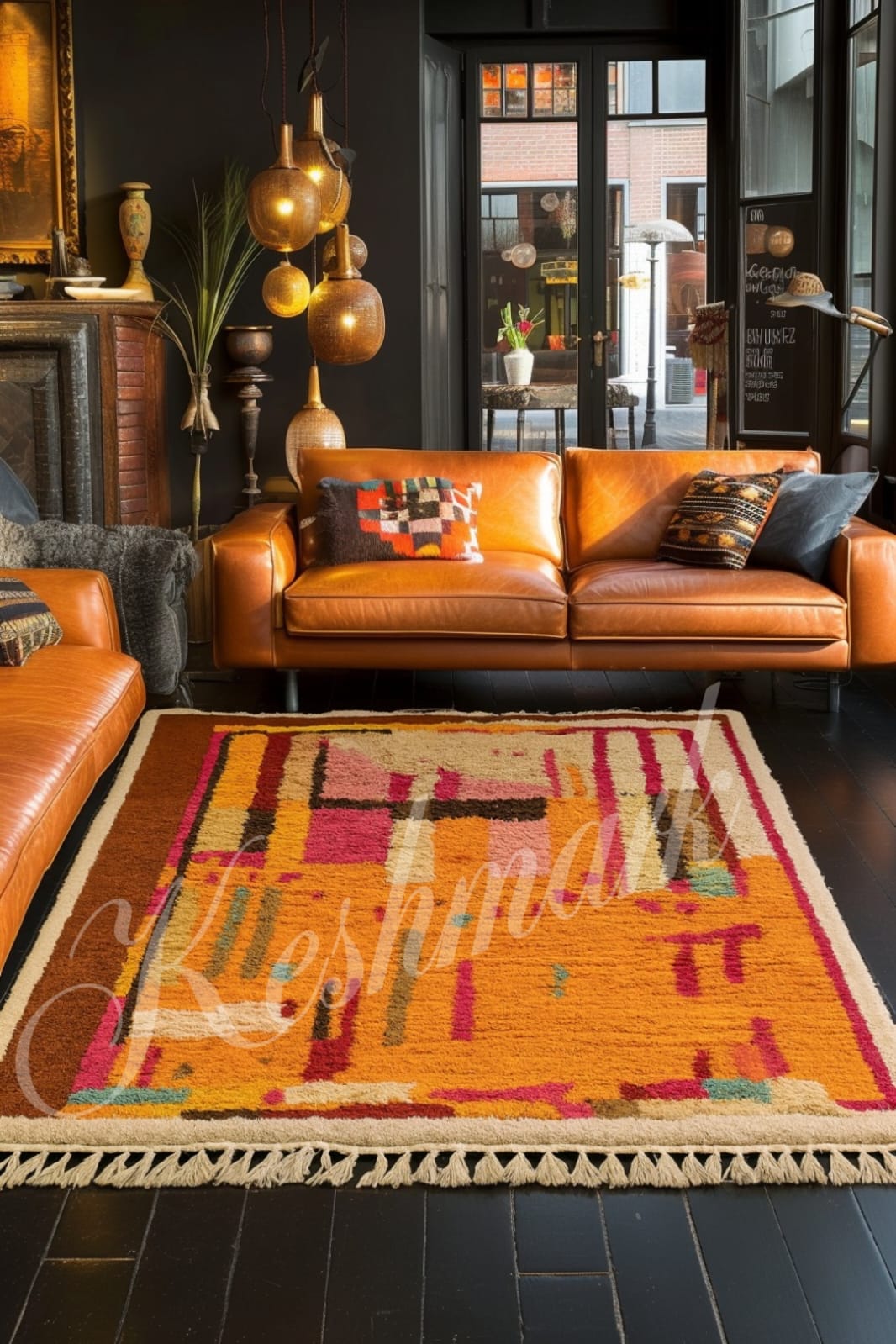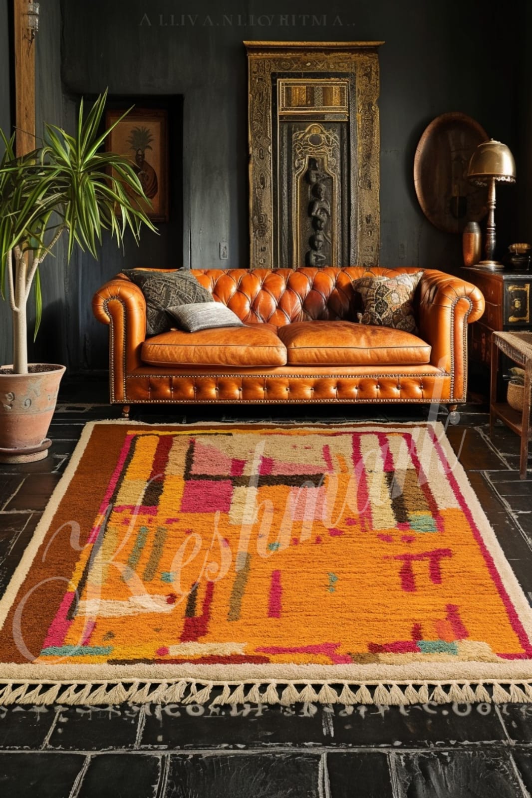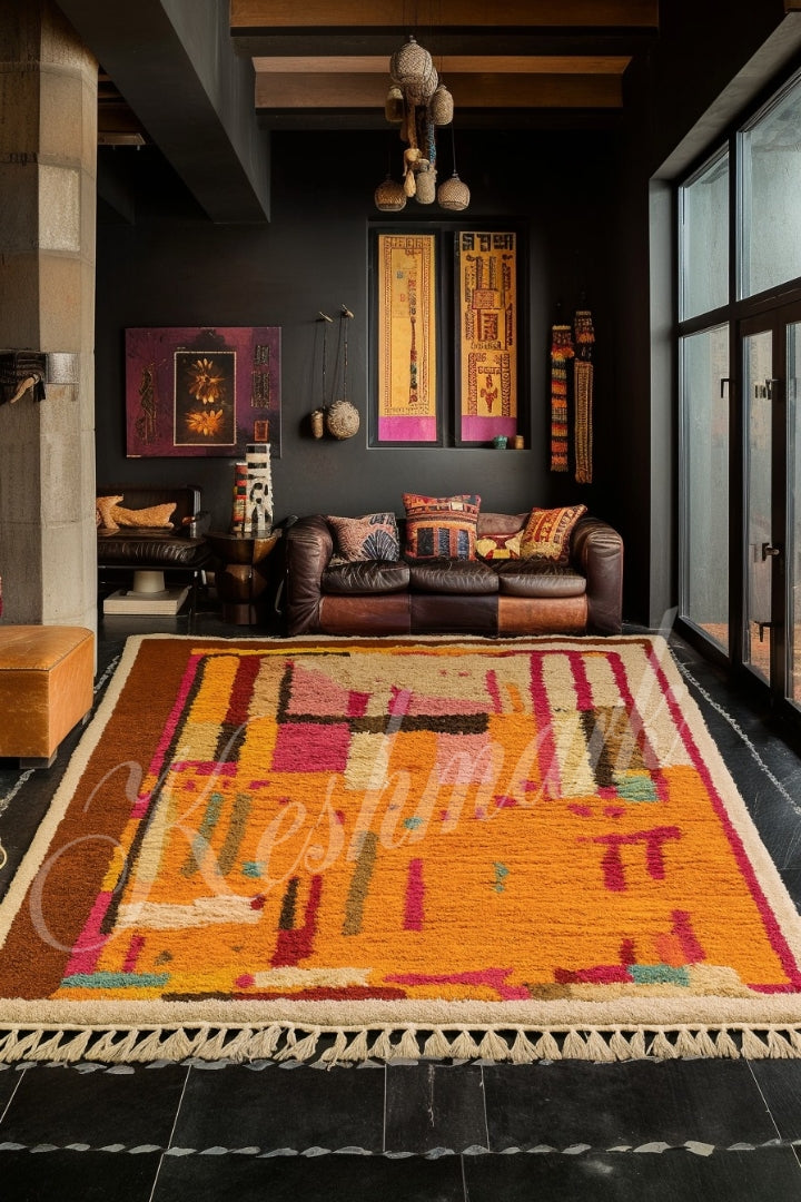 This rug features a stunning mix of orange, pink, red, beige, and multicolor accents, creating a bold abstract design that instantly transforms any room into a warm, artistic, bohemian space.