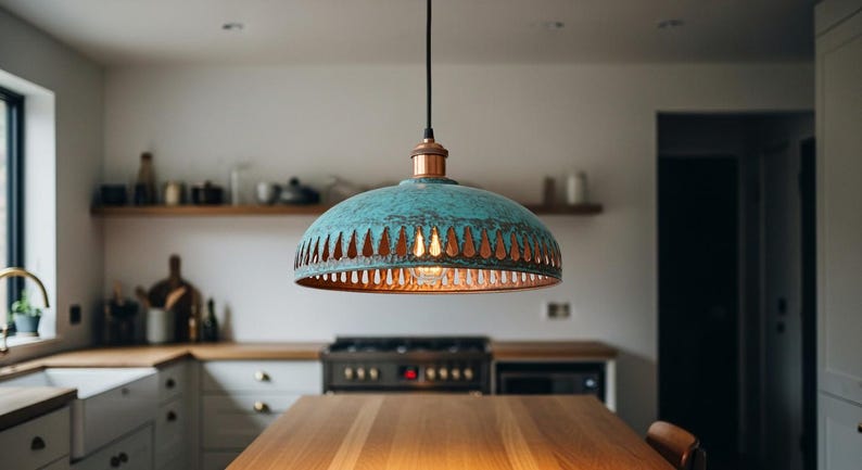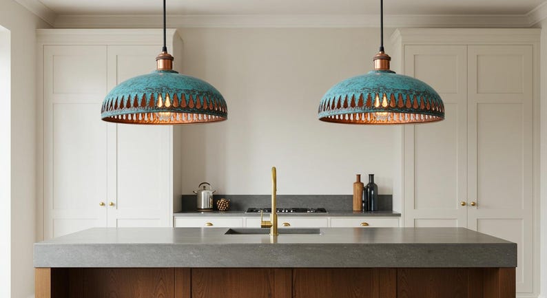 ✨ The rich contrast between the polished copper base and the oxidized green patina top adds character and depth to the lamp, casting a warm, elegant glow. Ideal for kitchen islands, dining rooms, cafes, or entryways.