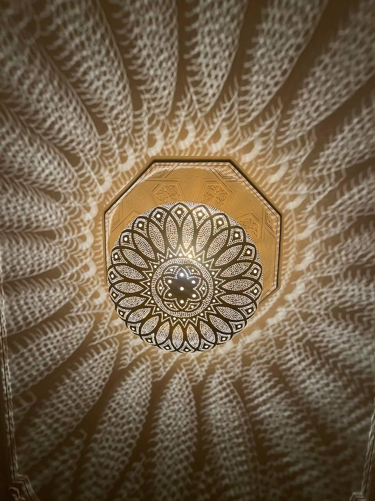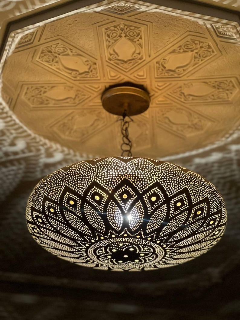 Simple Moroccan pendant lamp. A stunning Moroccan style hand-made ceiling light fixture- a pendant lamp is designed to enhance the exotic beauty of your home decor. Exclusive custom lighting designs from Arabian Home Décor will ensure that this Moroccan piece of art will complement your existing décor and completely enhance the ambiance by filling in the portion of darkness while leaving the remaining area soothing and serene
