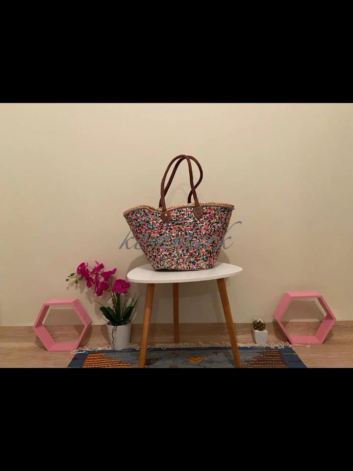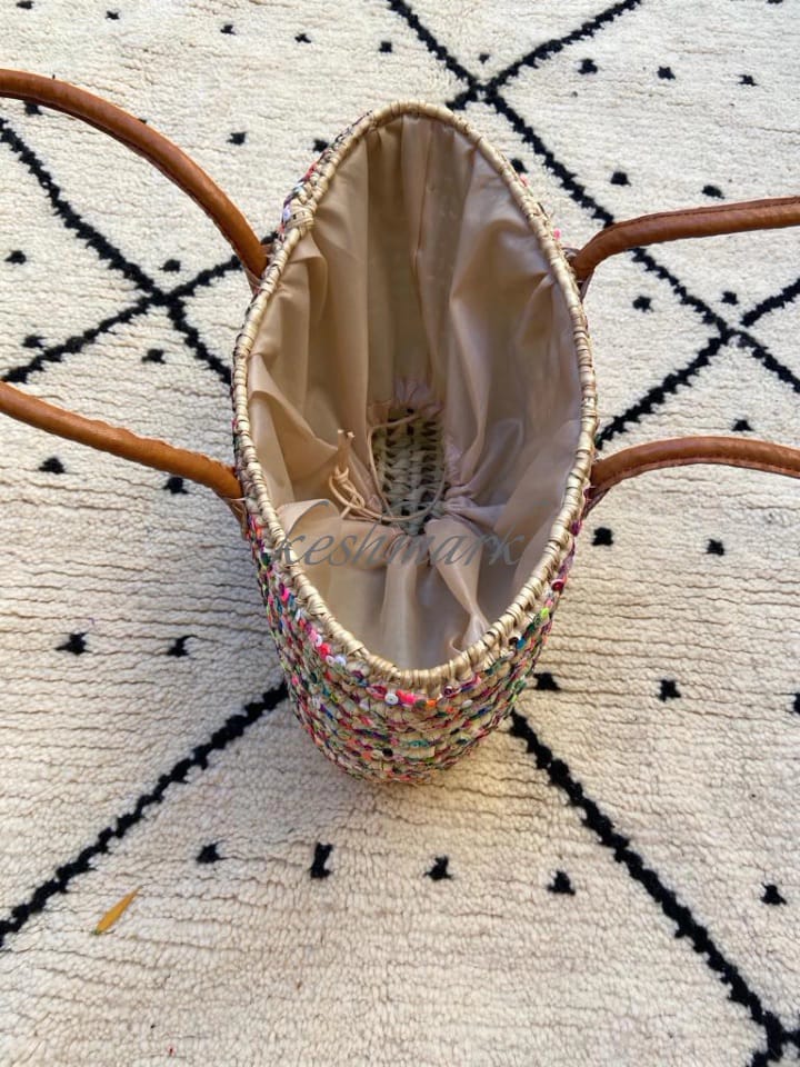 Moroccan Sequin Basket Bag – Handwoven Palm Leaf Tote with Leather Handles – Colorful Handmade Beach Bag by KESHMARK