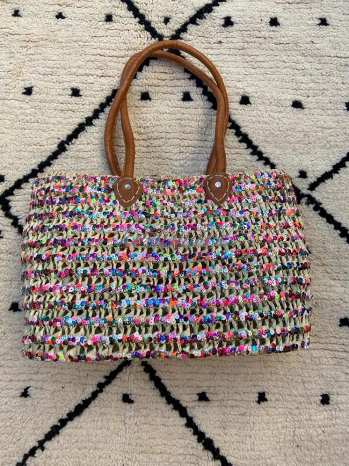 Bring sparkle and authentic craftsmanship to your everyday look with this stunning handwoven Moroccan basket. Carefully crafted from natural palm leaves and adorned with hundreds of colorful sequins, this bag captures the essence of Marrakech’s vibrant souks.