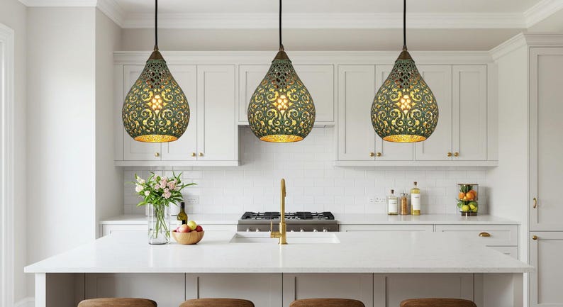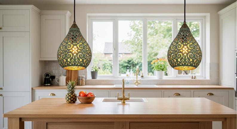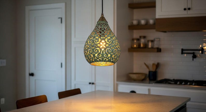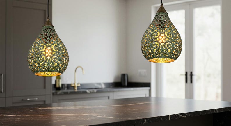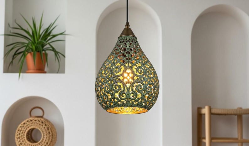 Elevate your space with this stunning Moroccan teardrop pendant, handcrafted from brass with a rich verdigris patina. The intricate cut-out patterns create a mesmerizing play of light and shadow, casting a warm, decorative glow—perfect for entryways, dining rooms, or cozy corners. A true artisan piece that brings exotic elegance to any interior.
