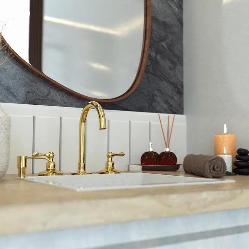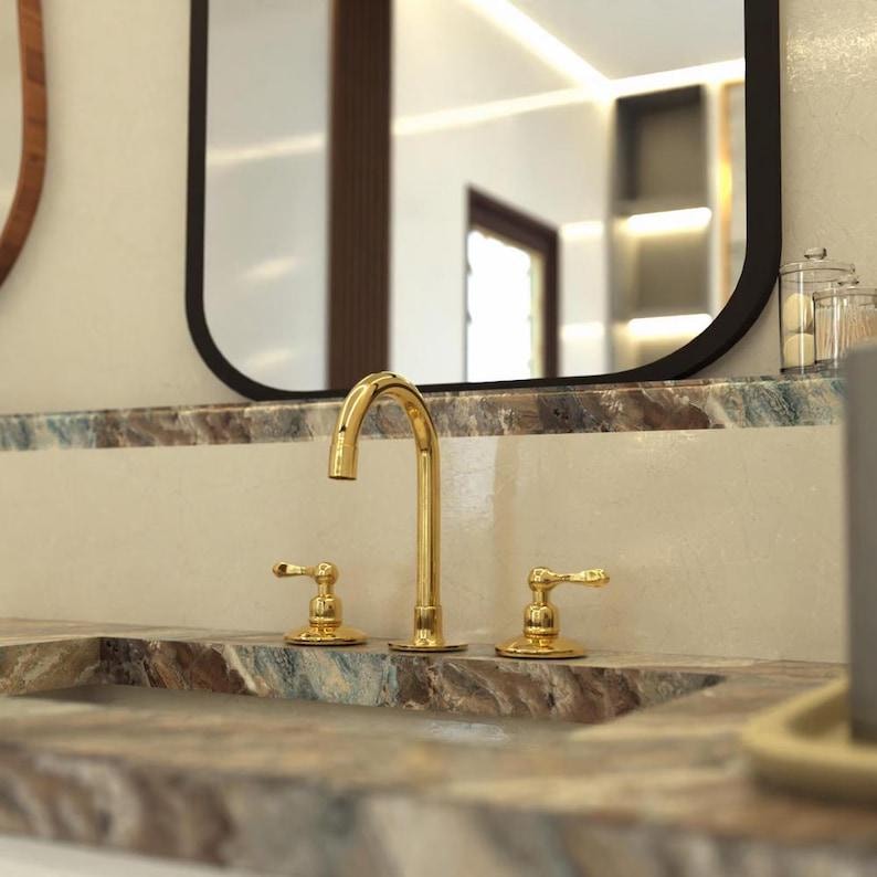 This deck-mounted unlacquered brass faucet is a timeless centerpiece that evolves with age, gaining a distinctive patina that enhances the character of your bathroom.