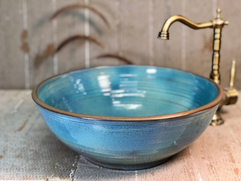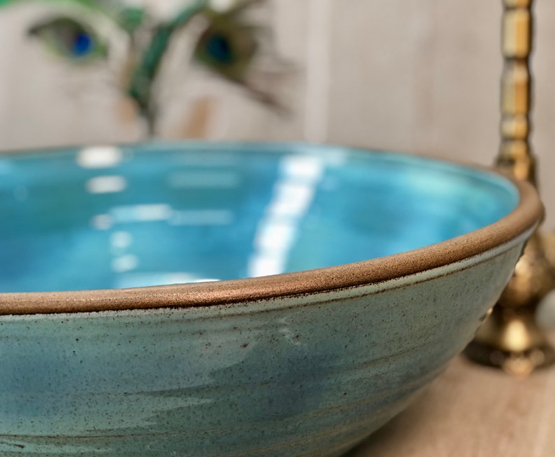 Dreamy turquoise, green, and blue ceramic vessel sink – a handmade tabletop basin with a bronze-toned clay rim, crafted for those who seek both beauty and durability. Fired at 1200°C for strength and longevity, this sink is more than functional – it’s a work of art.