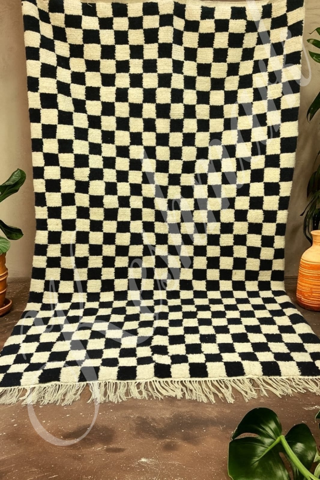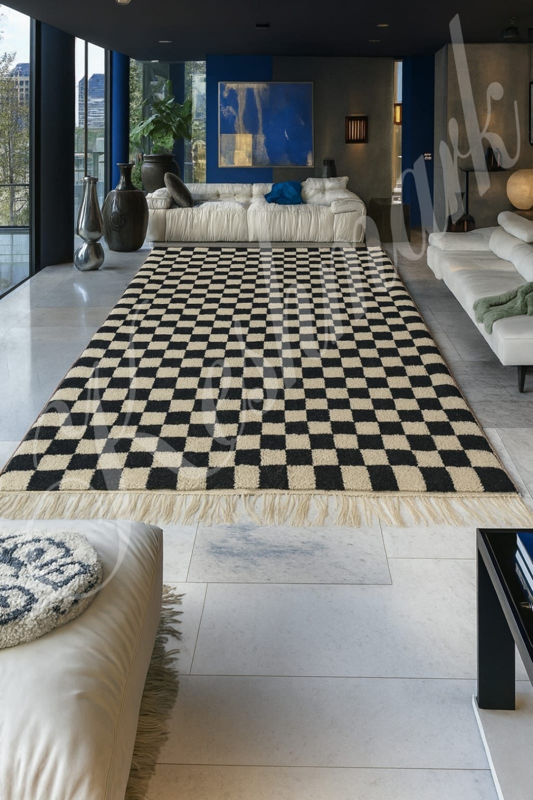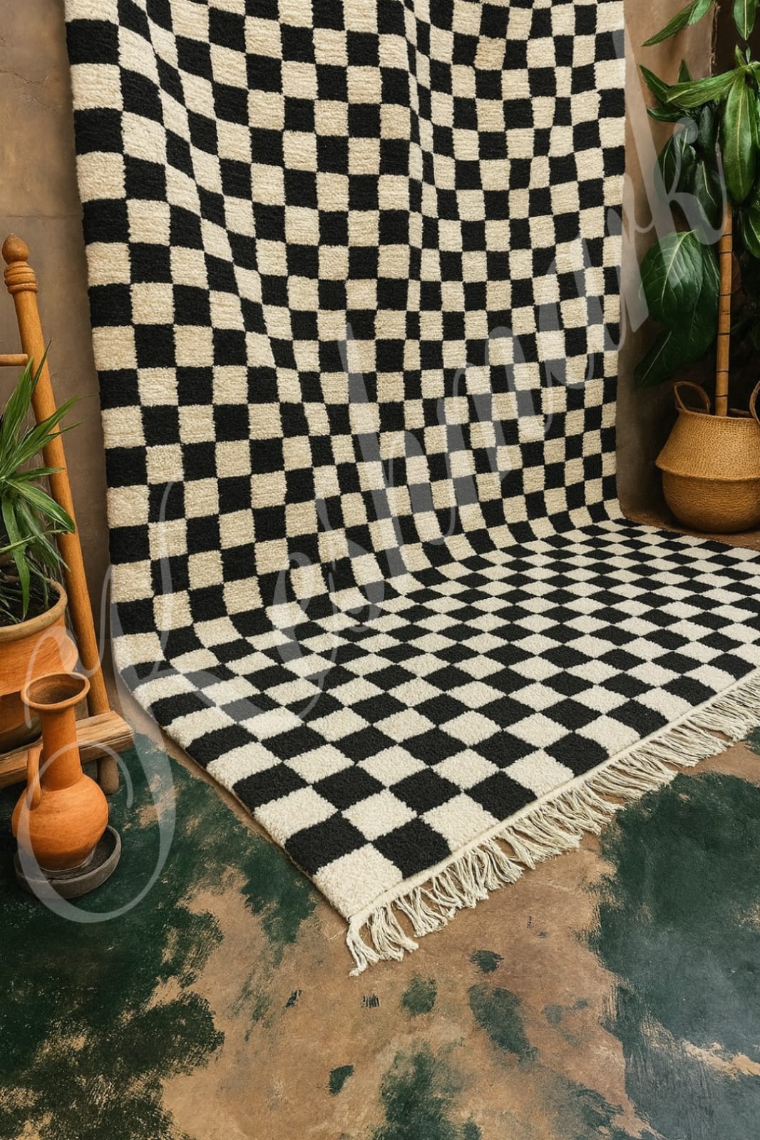 Black and white Moroccan Rug – Handmade Woven Area Rug with Fringe | Retro Checkerboard Decor | Modern Boho Home Accent