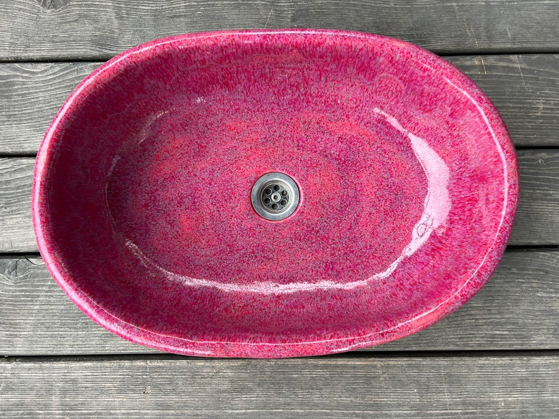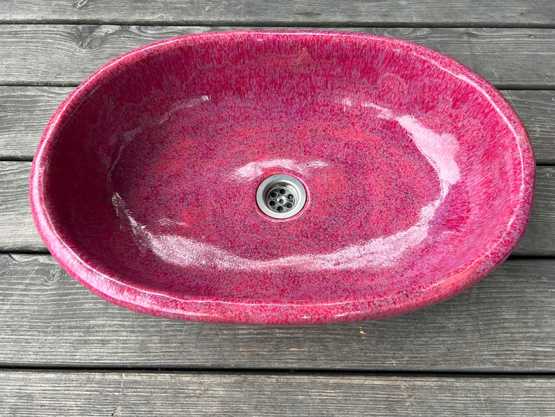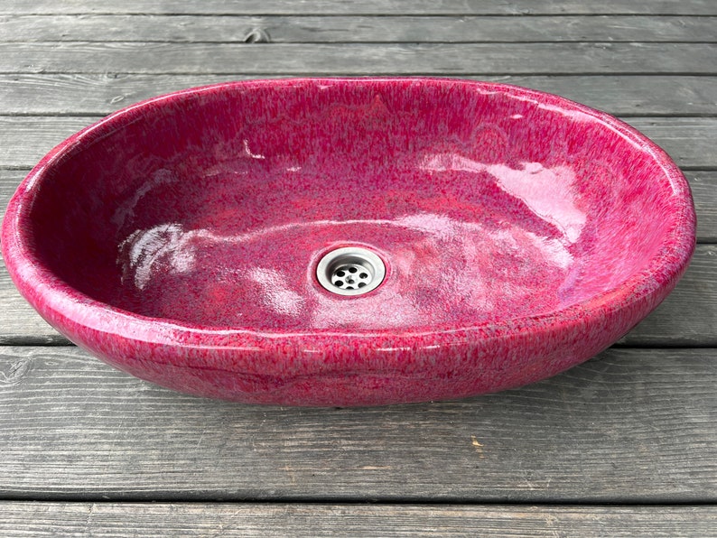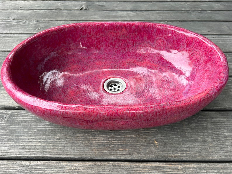 Oval, large ceramic washbasin. Rapsbery pink. Countertop, ceramic, hand-made, functional and durable. Multiple glazed and fired, making it tight and durable.