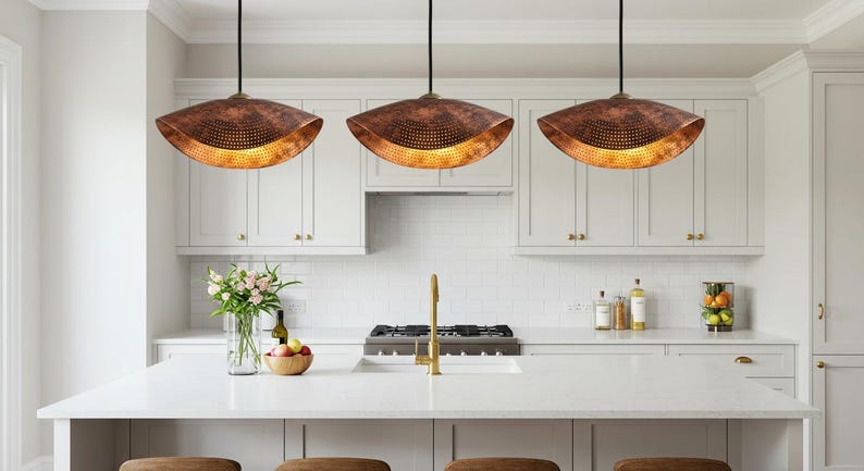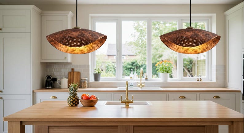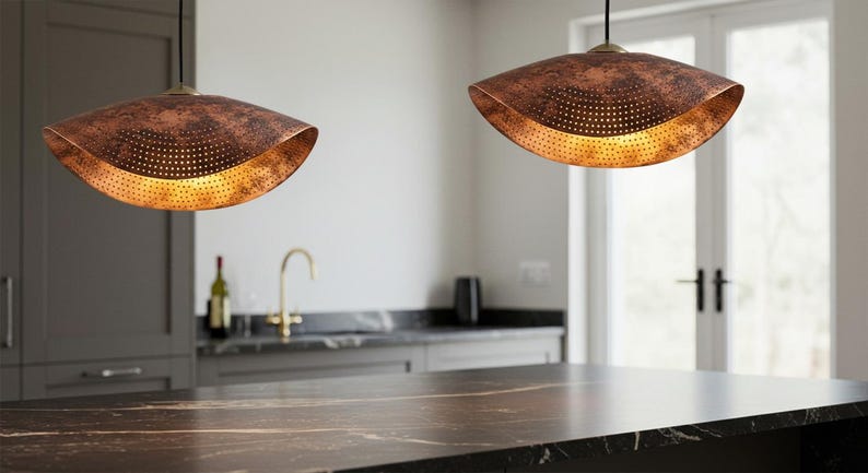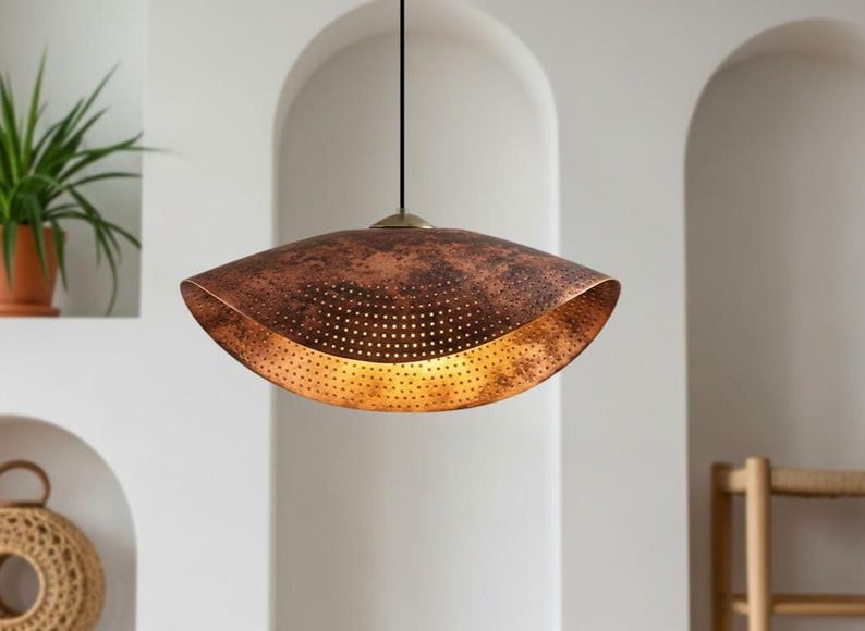 This copper pendant light doesn’t just brighten a room — it transforms it. The warm glow and rustic finish create a cozy, inviting atmosphere that blends old-world charm with modern elegance. Whether it’s over a kitchen island, in a dining space, or an entryway, it sets a mood of timeless sophistication and handcrafted beauty.