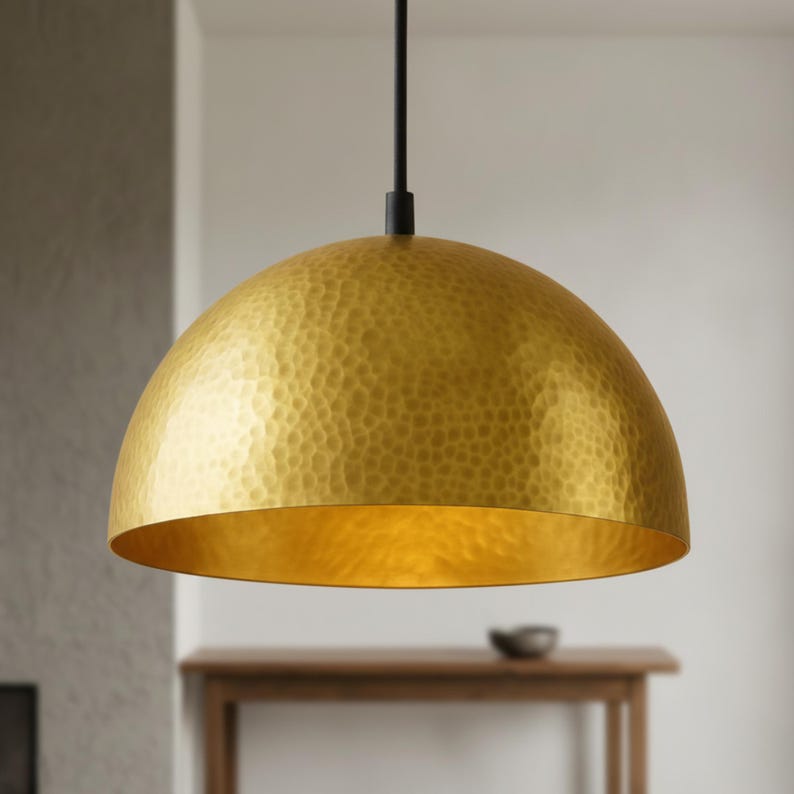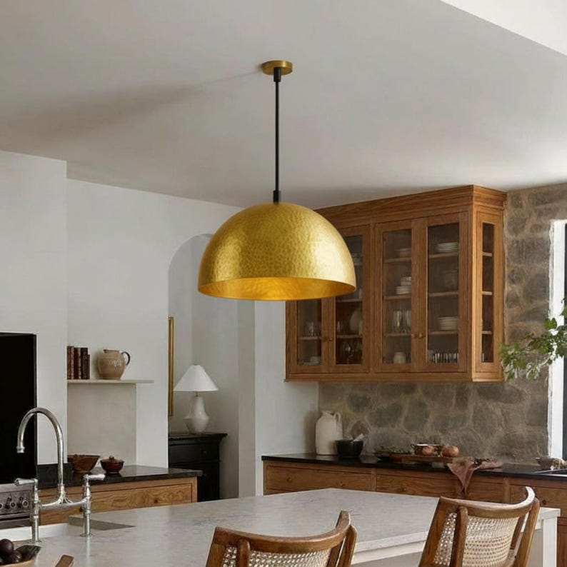 This pendant lamp pairs a warm, hammered brass dome with clean lines for focused downlighting. A versatile ceiling light for kitchen islands, dining rooms, and entryways—works in modern, rustic, boho, or vintage spaces.