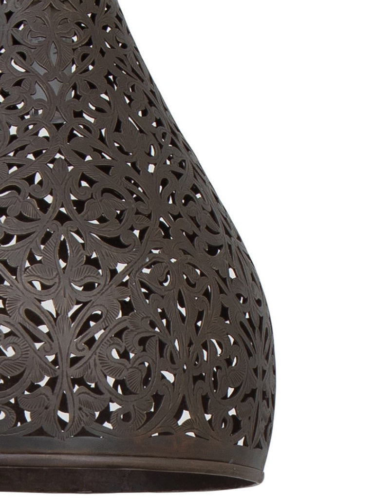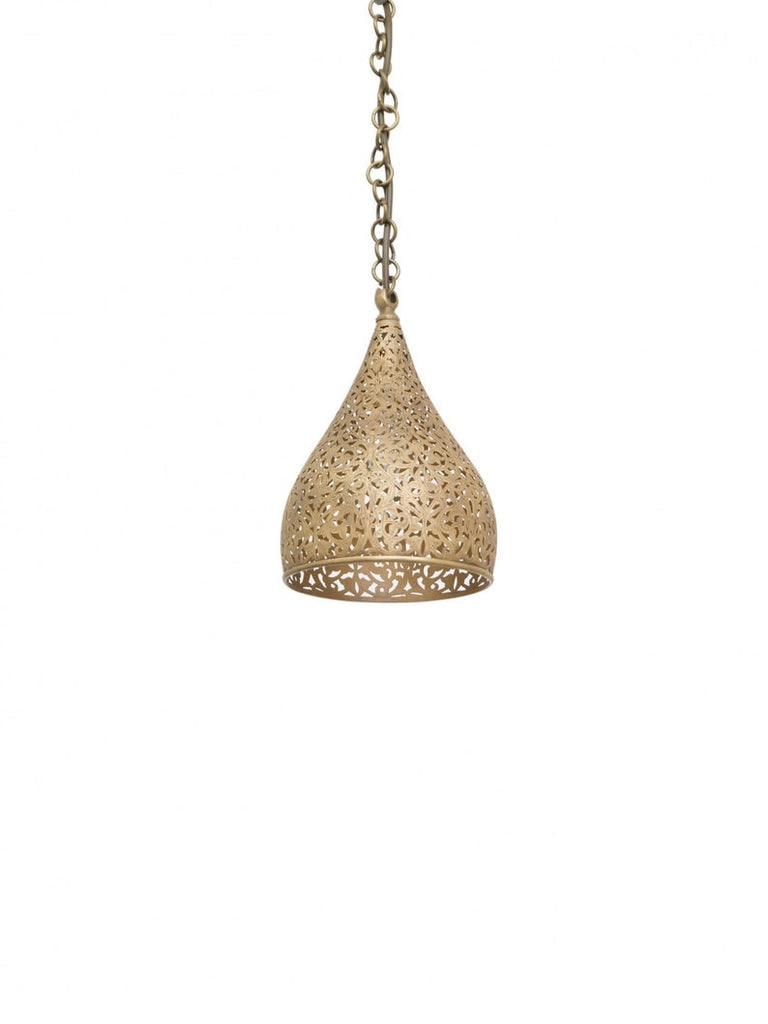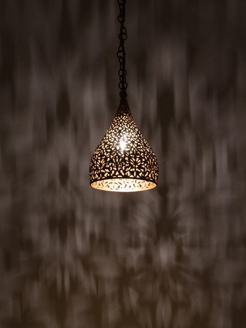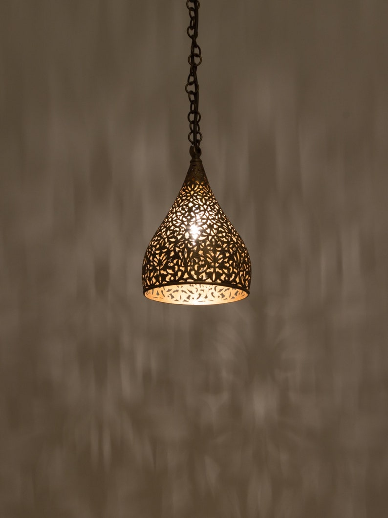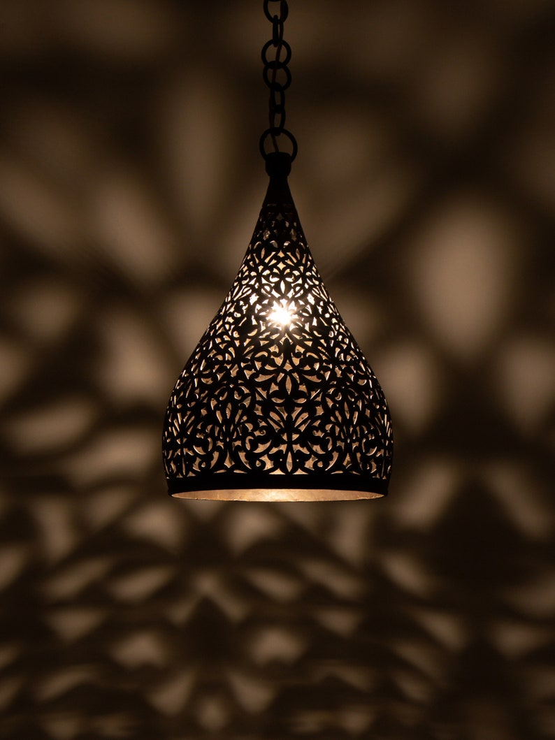 Our antique brass Cone pendant lamp is perfect for smaller spaces. Its shape allows for plenty of clean light to project as well as a subtle patterned light to emit through its floral design. This small cone shaped Moroccan ceiling light has been pierced by hand, using a fine blade fretsaw tool to create intricate patterns that really catch the eye.