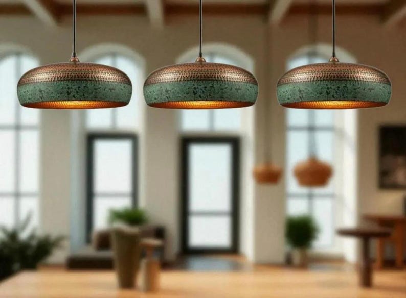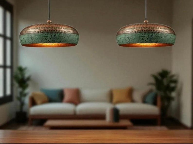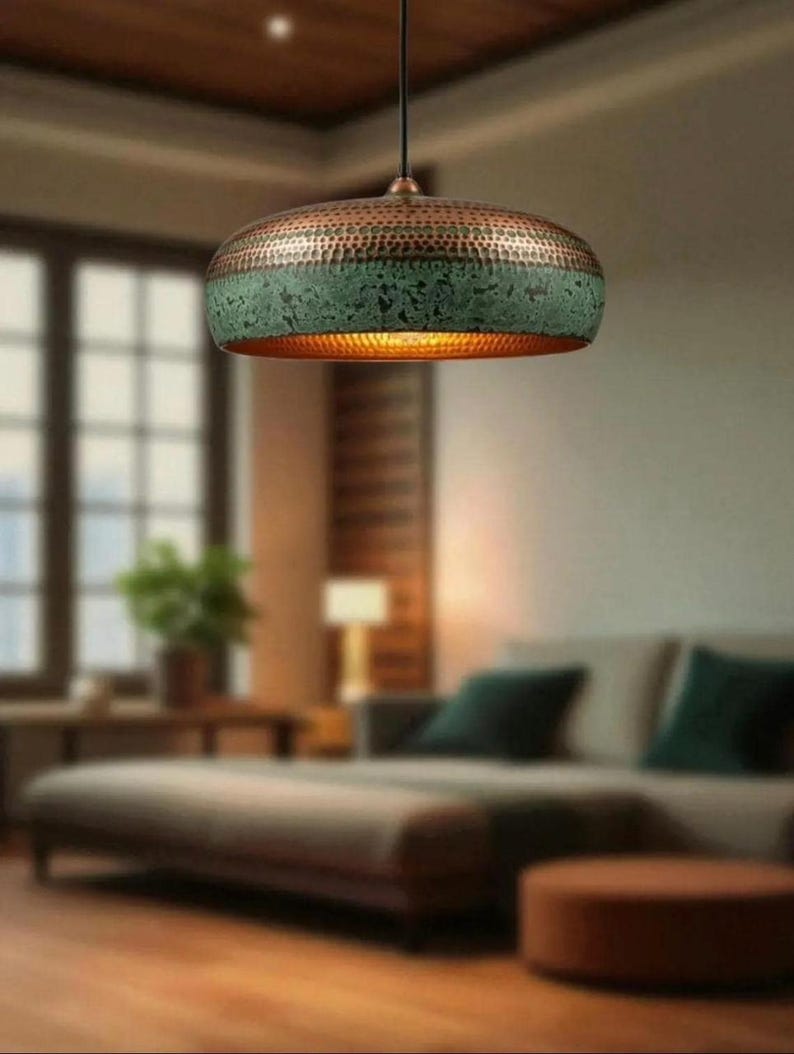 Make a bold statement with this handcrafted copper pendant, featuring a unique perforated band and rich verdigris patina. The textured hammered details and warm copper interior create a stunning glow with subtle light effects—perfect for living rooms, dining spaces, or modern rustic interiors. Each piece is one of a kind.