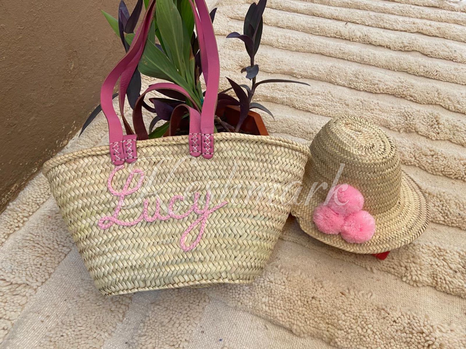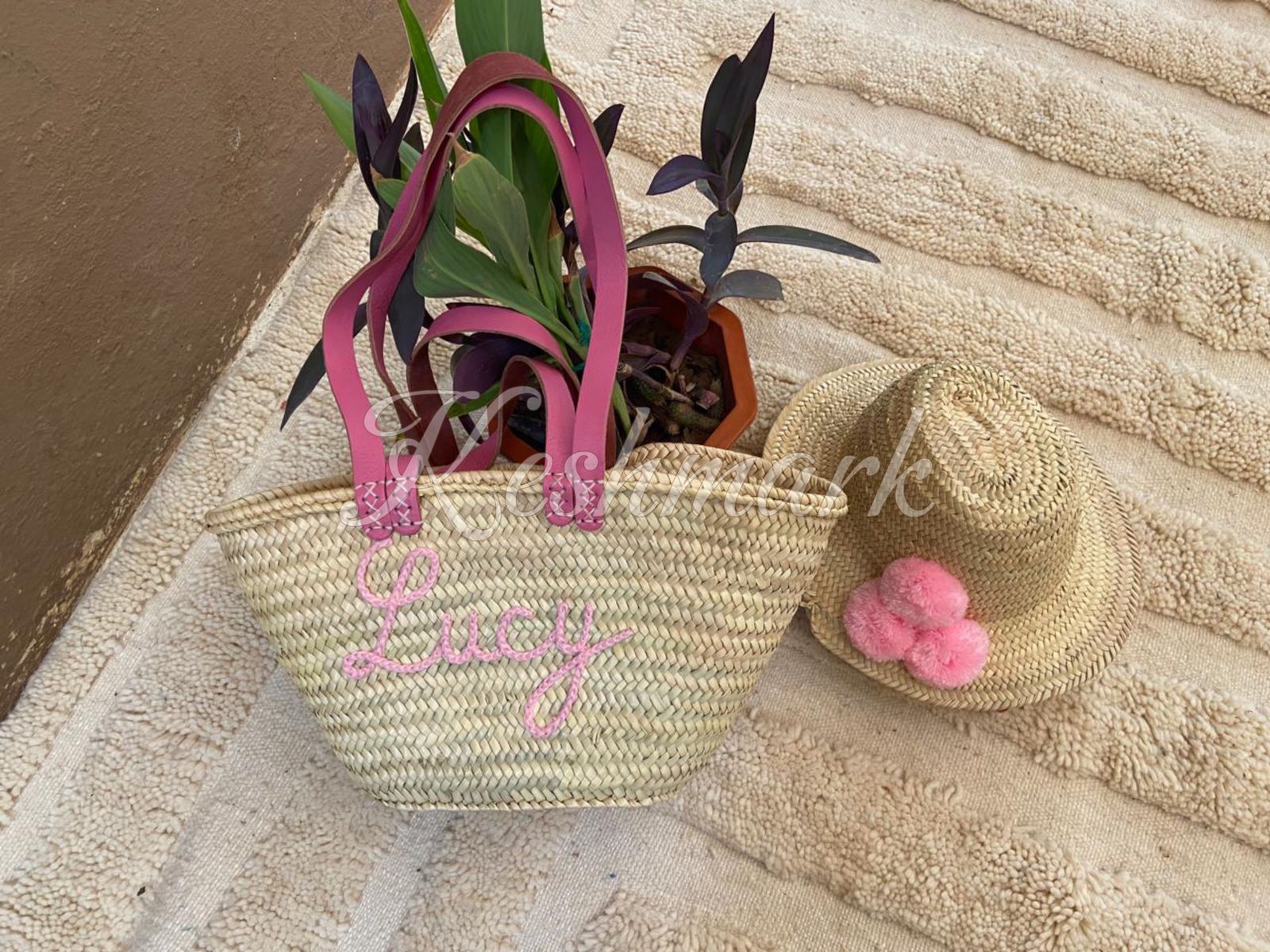 Personalized Straw Bag with PINK Leather Handles β Handmade Moroccan Basket with Custom Name Embroidery β Boho Beach & Market Tote