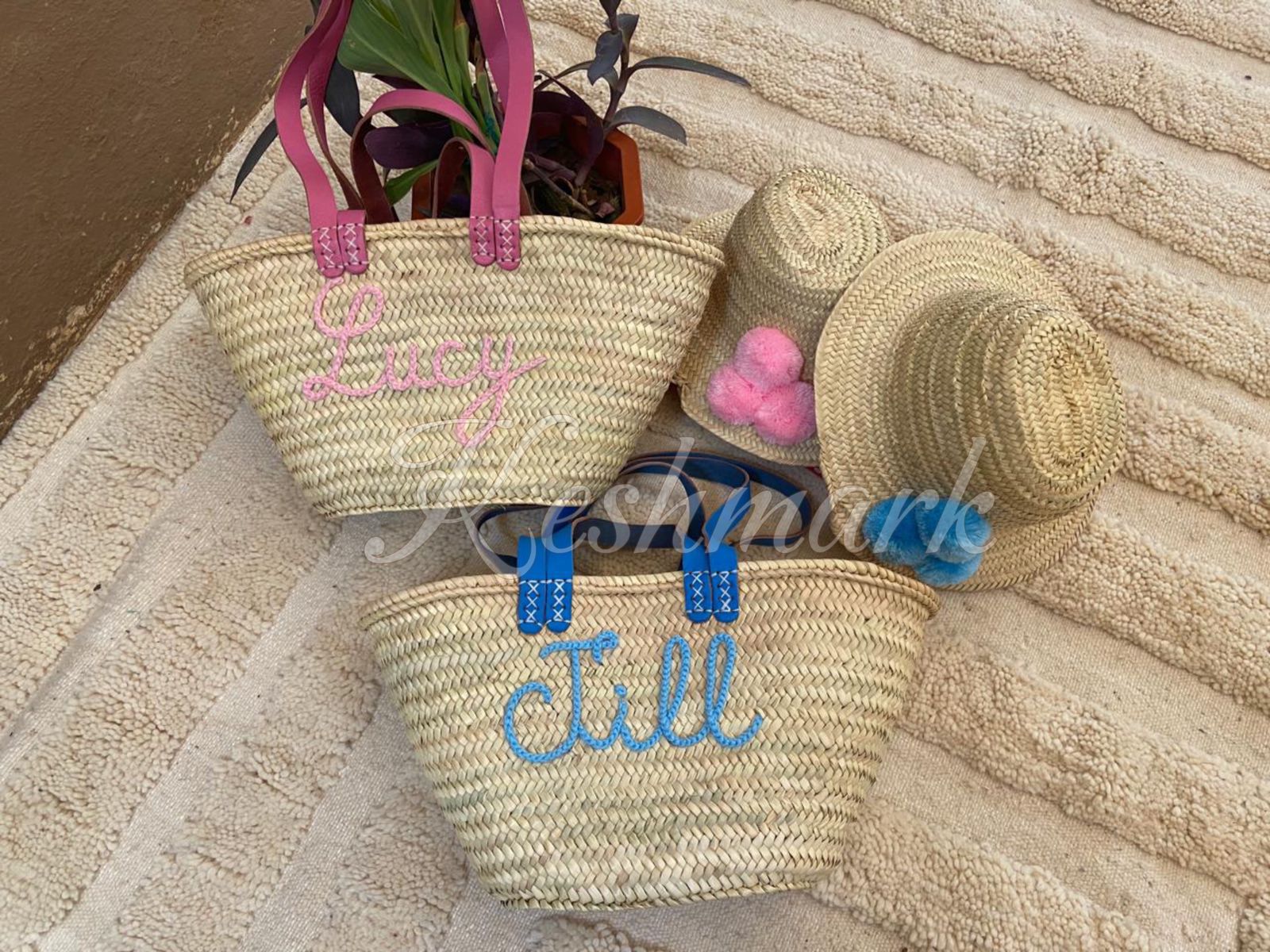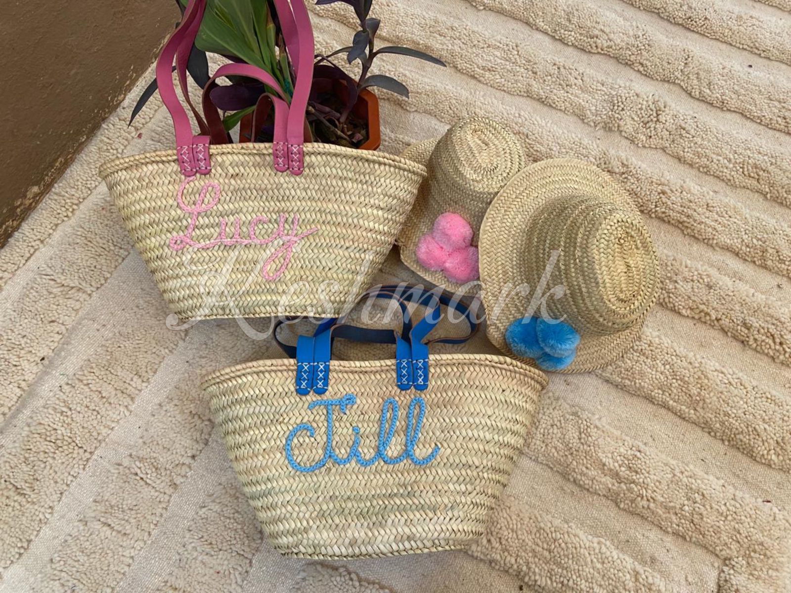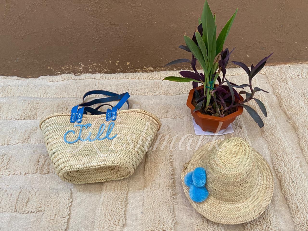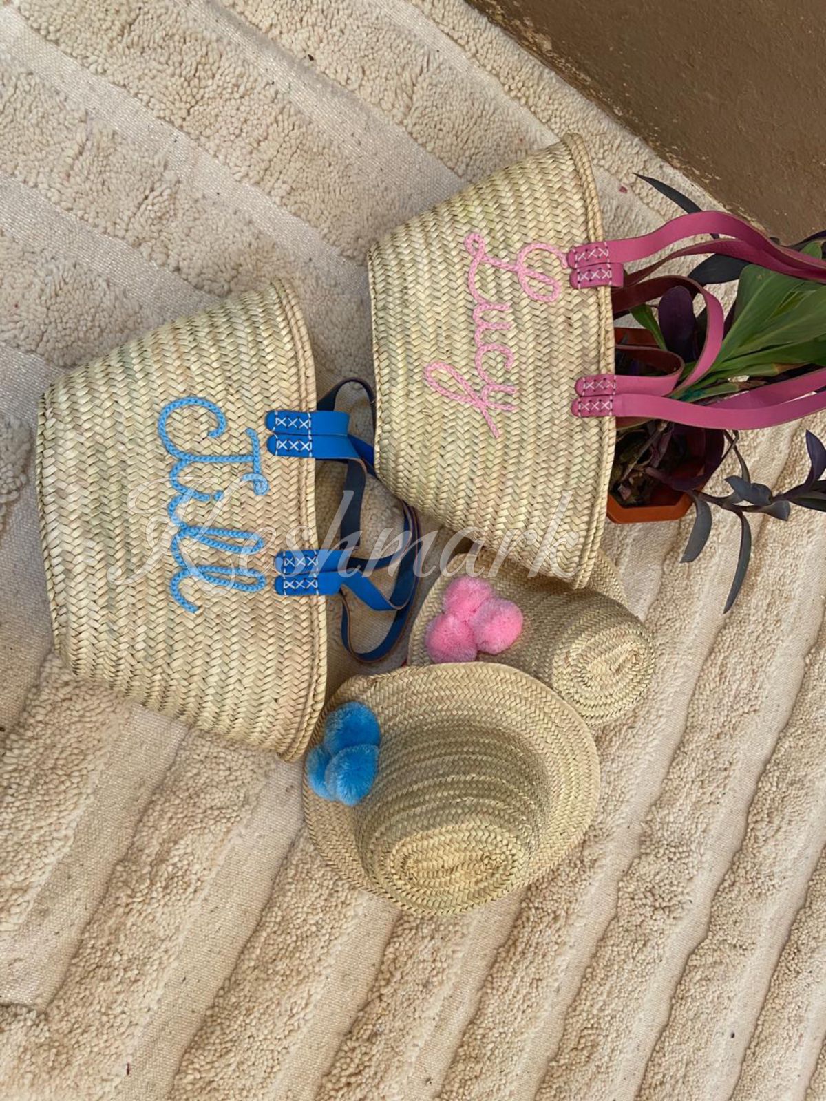 This charming personalized straw bag and hat set is handmade in Marrakech, Morocco, using natural woven palm leaves and finished with genuine leather handles. Each piece is carefully crafted by skilled artisans, combining traditional Moroccan craftsmanship with a modern, elegant design.