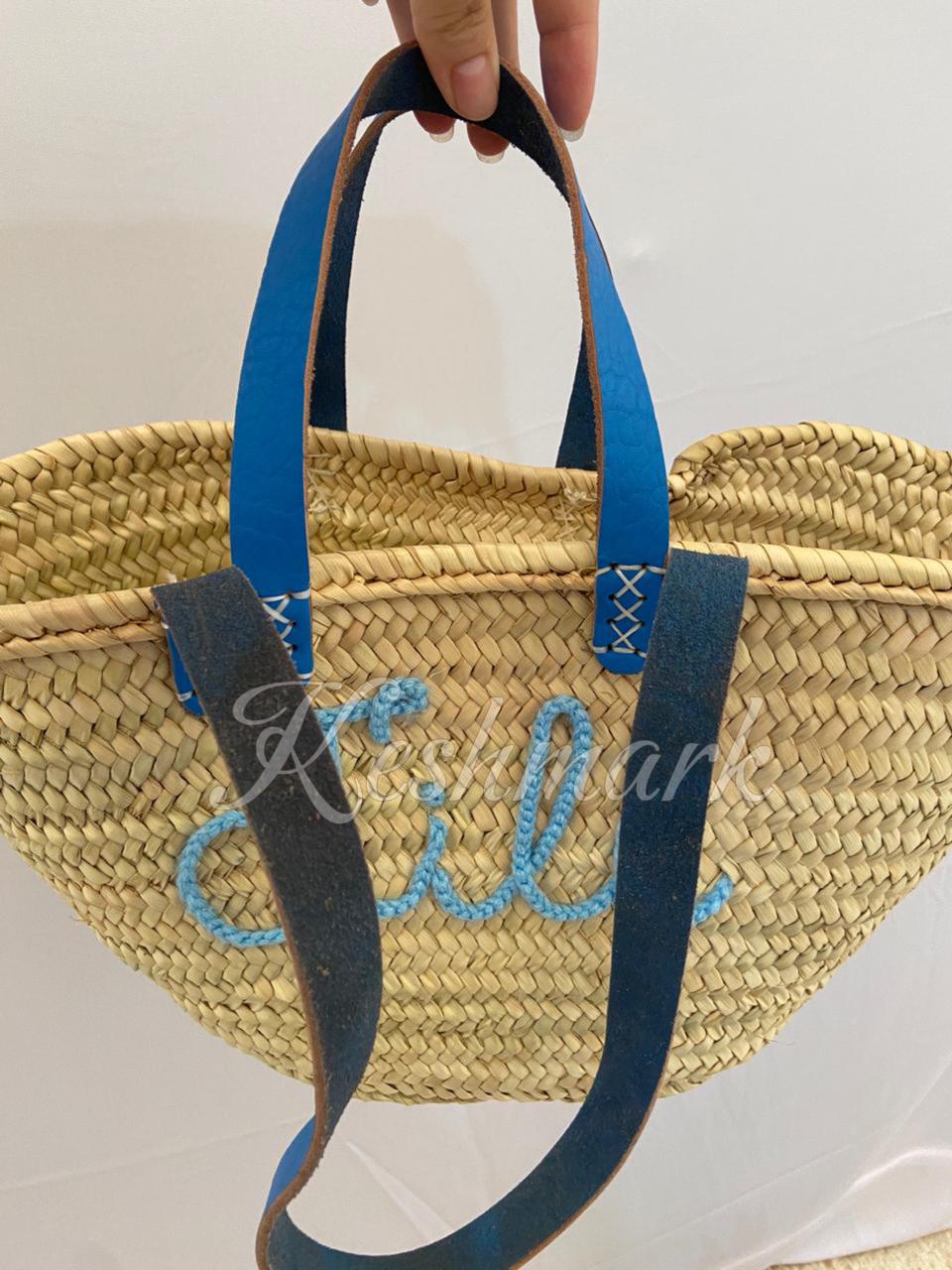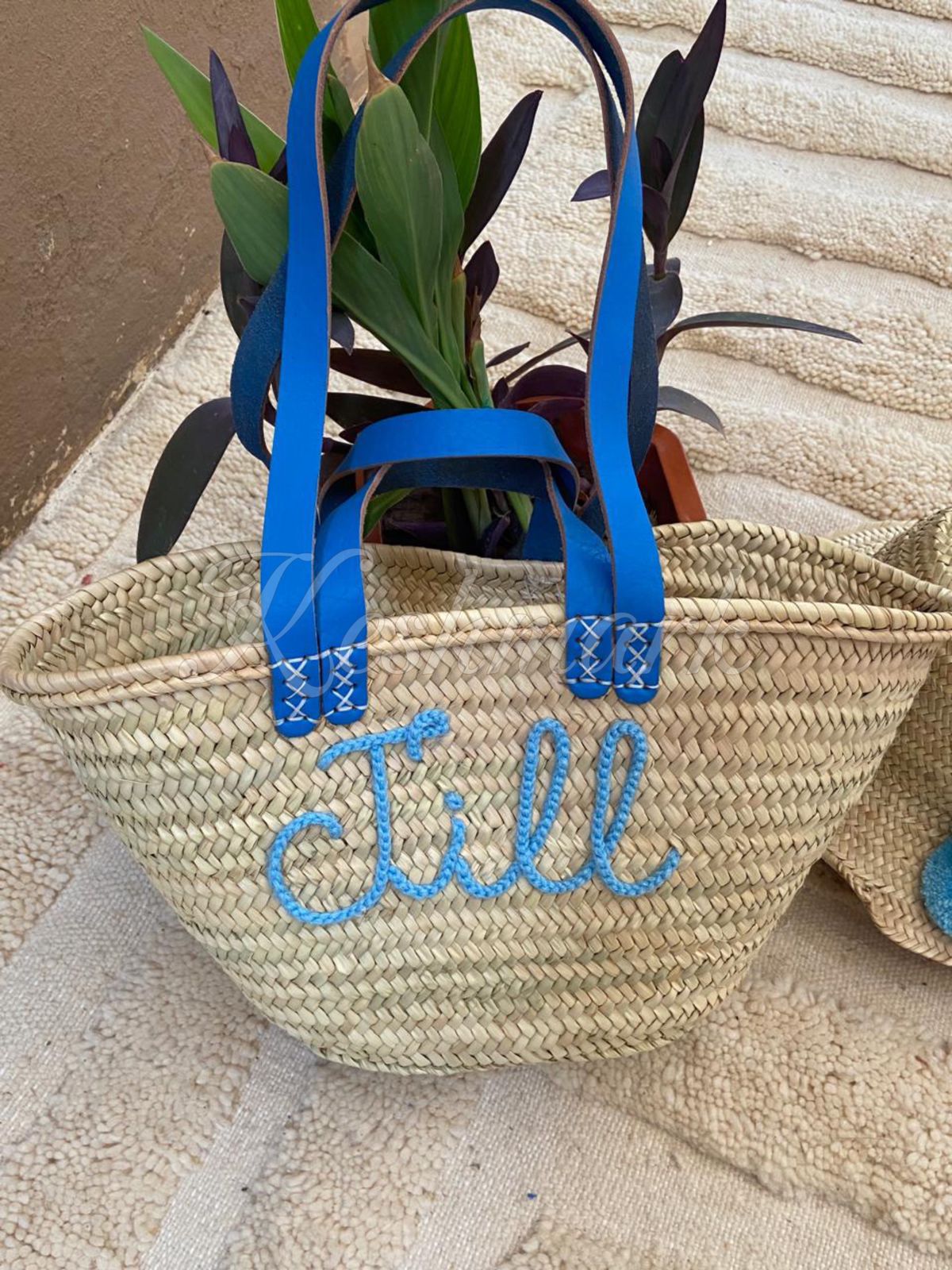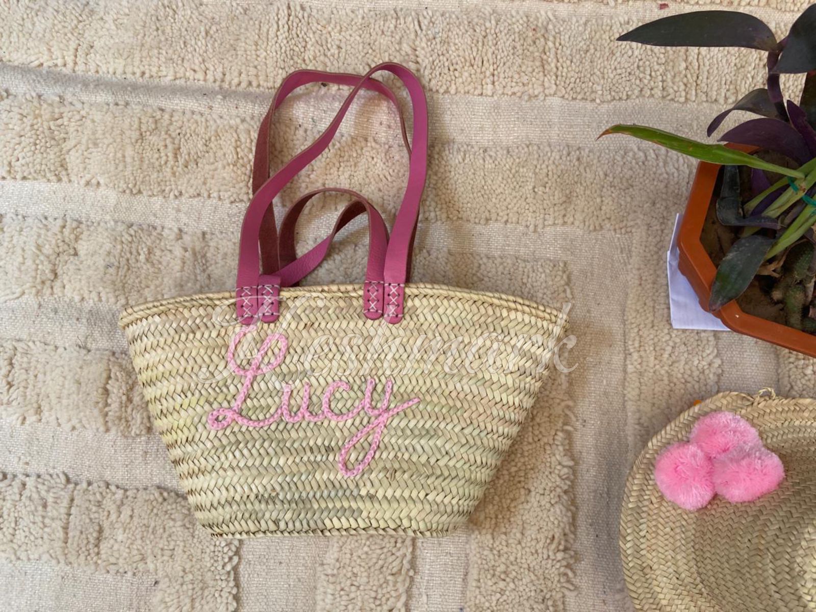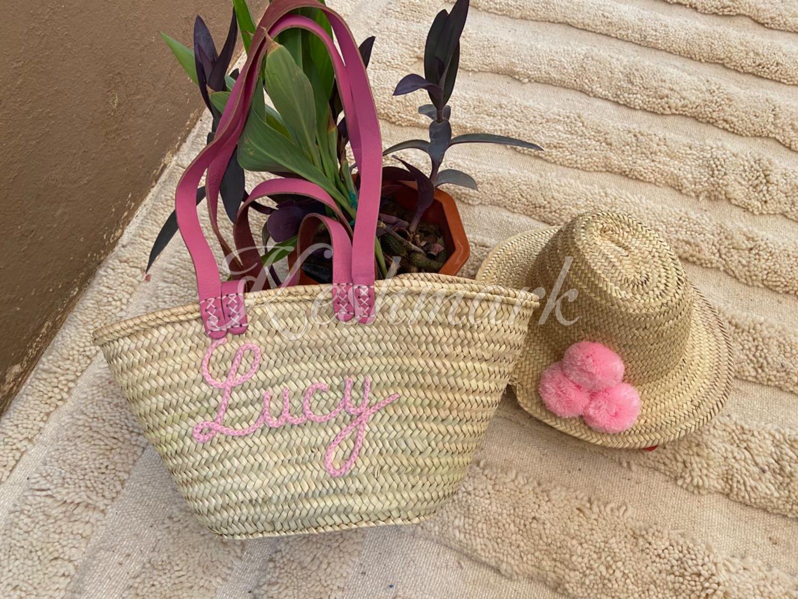 This charming personalized straw bag and hat set is handmade in Marrakech, Morocco, using natural woven palm leaves and finished with genuine leather handles. Each piece is carefully crafted by skilled artisans, combining traditional Moroccan craftsmanship with a modern, elegant design.
