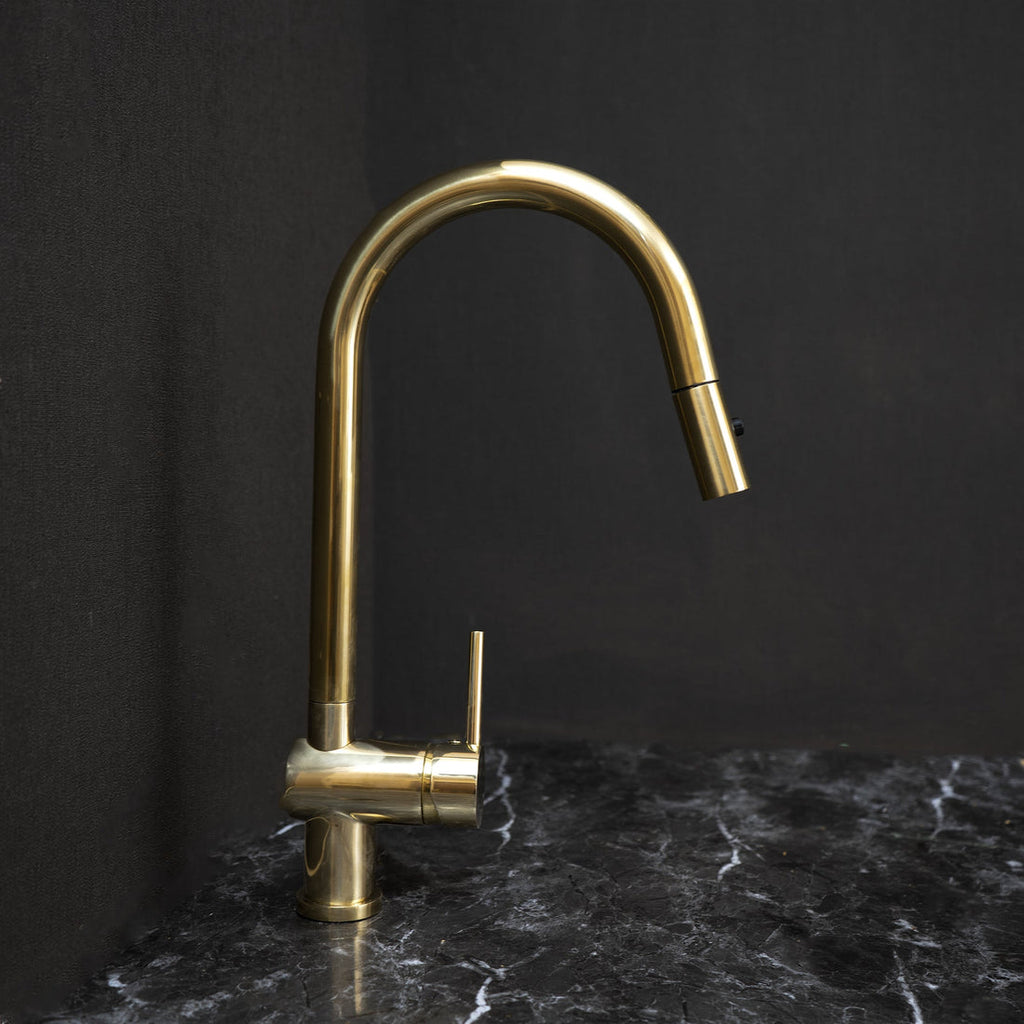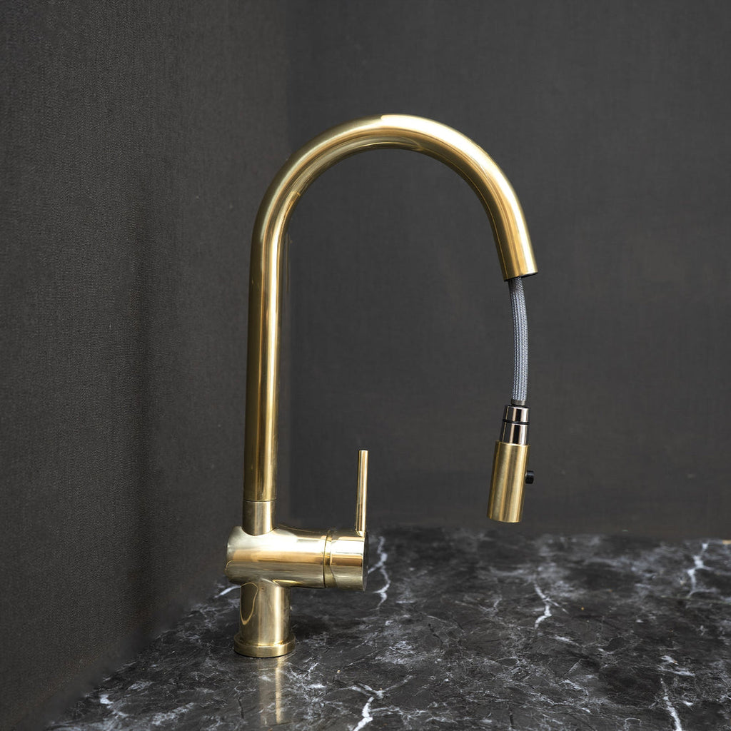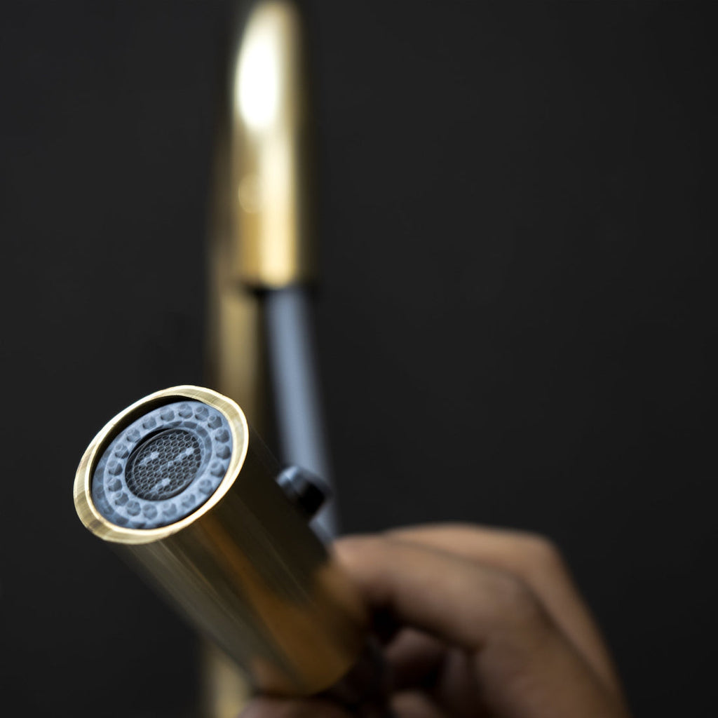 This Brass Kitchen Faucet with a pull-down sprayer has a 360-degree swivel gooseneck that will make it the perfect focal point for your Kitchen. The design of this solid brass product is inspired by industrial steam pipes.