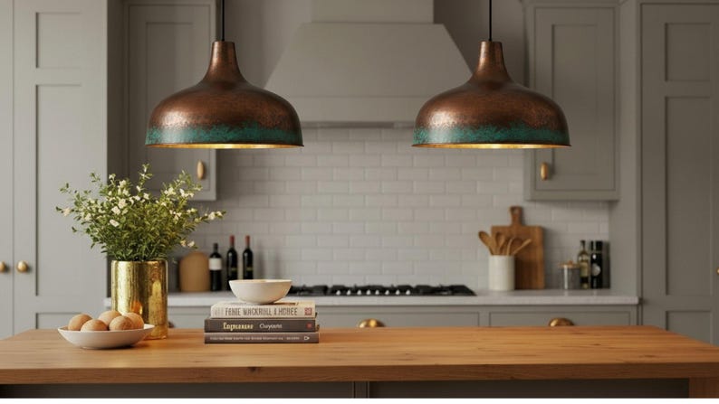 Add timeless warmth to your space with this handcrafted copper pendant, featuring a rich aged finish with subtle verdigris accents and a glowing brass interior. The smooth dome shape creates a soft, inviting light—perfect for dining areas, kitchen islands, or modern rustic interiors. Each piece is uniquely finished for an authentic artisan feel.