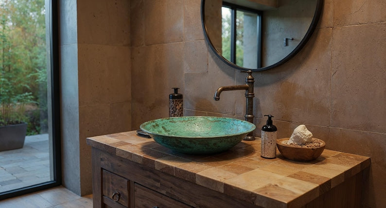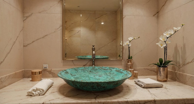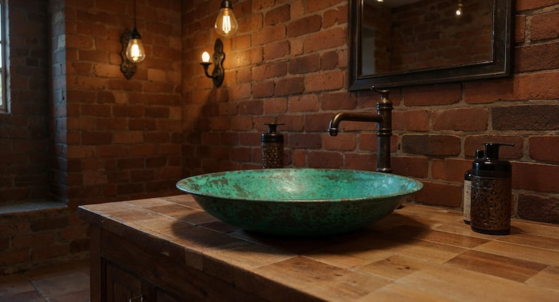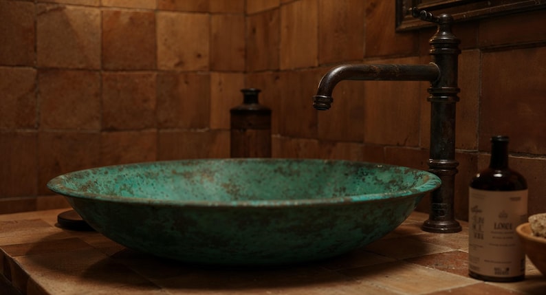 Rustic Patina Copper Sink – Handmade Hammered Vessel Basin for Bathroom Vanity
