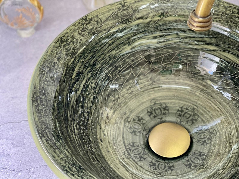 Inside the sink, dark brush strokes create a dramatic contrast, allowing delicate prints to subtly emerge through the strokes. This intricate detailing adds depth and character, making each sink a one-of-a-kind masterpiece.