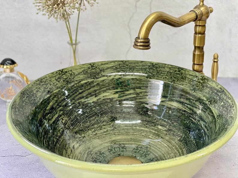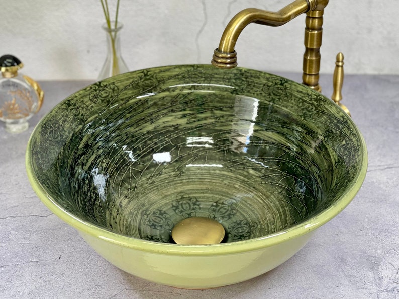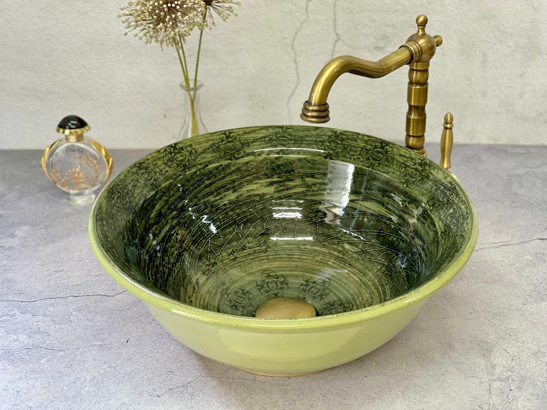 Rustic Vintage-Style Sink with Glossy Finish. Countertop handmade vessel sink.