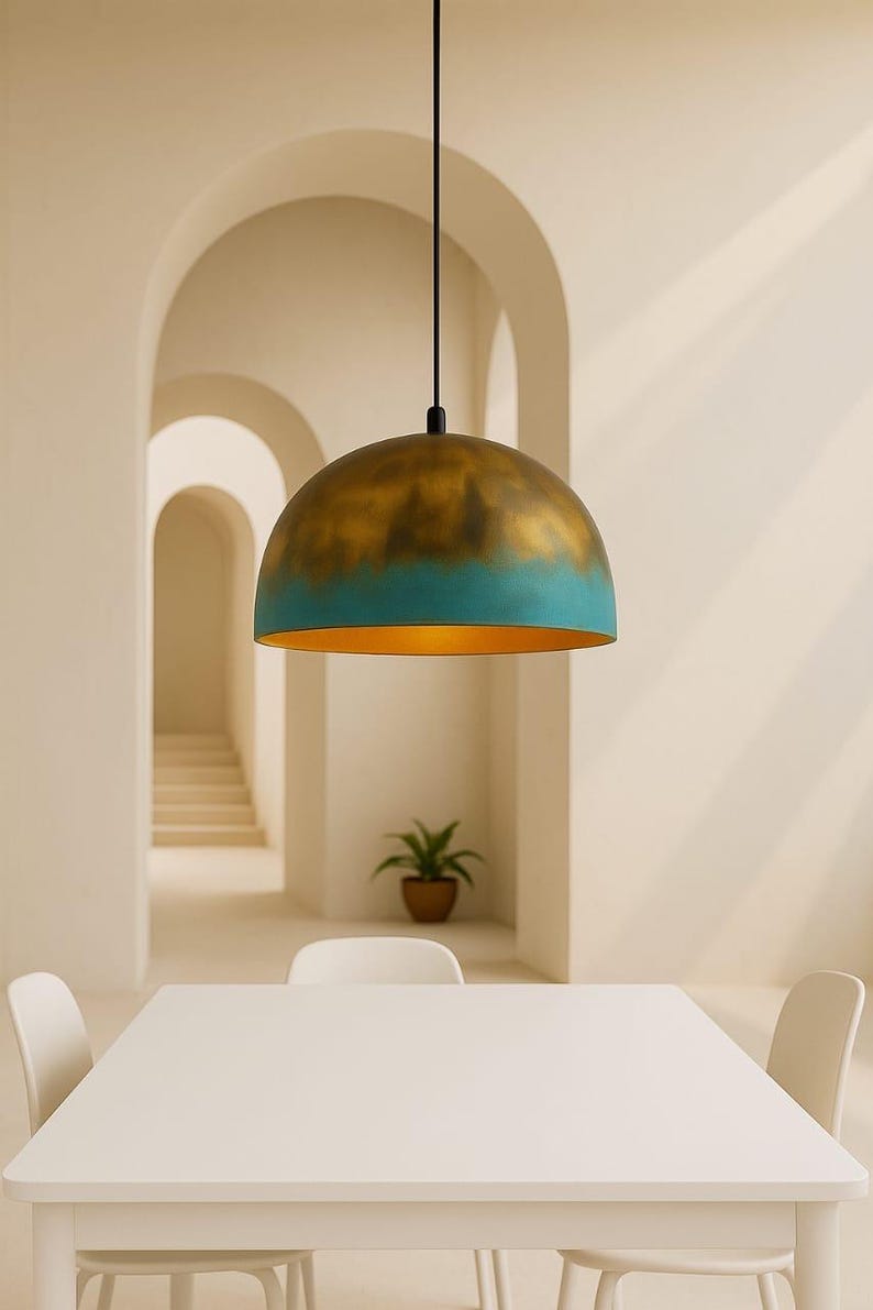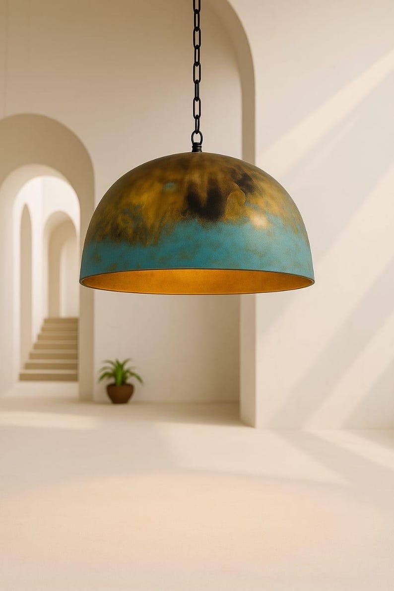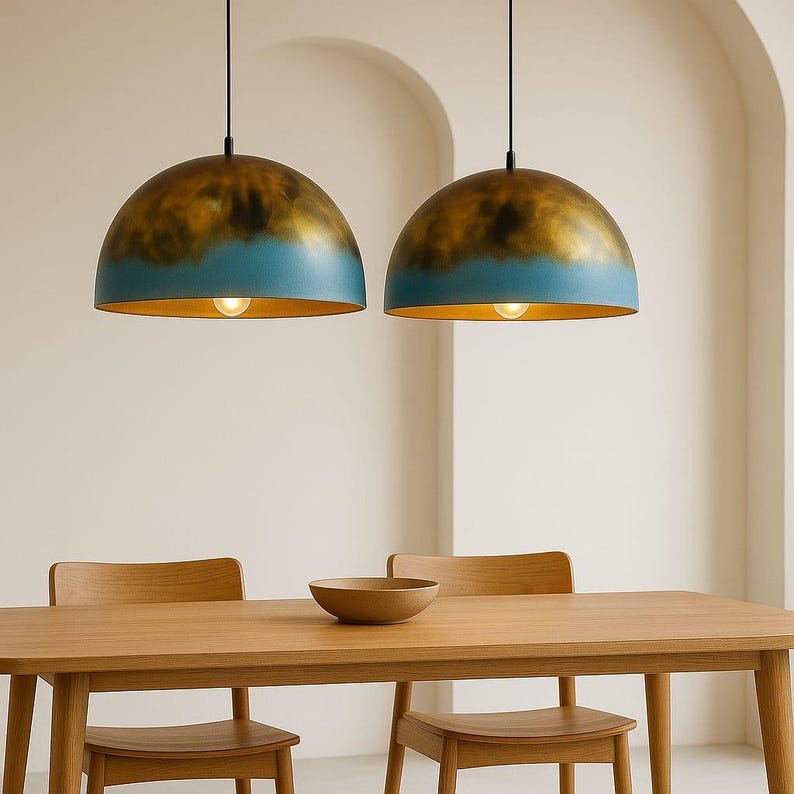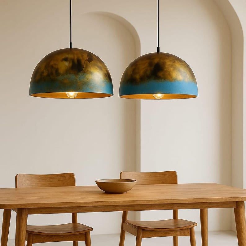 Set of 2 Green Patina Copper Dome Pendant Light: Moroccan Kitchen Island Lamp