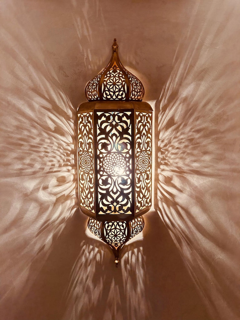 Infuse your space with the rich ambiance of Moroccan design through this exquisite handcrafted brass wall sconce. Lovingly made by skilled artisans, each piece features delicate patterns inspired by centuries-old Moroccan architecture, casting enchanting shadows when lit.