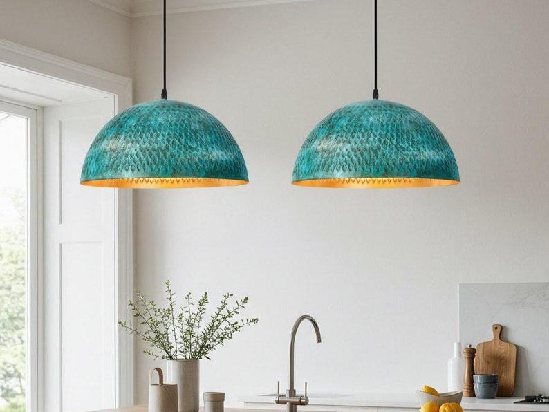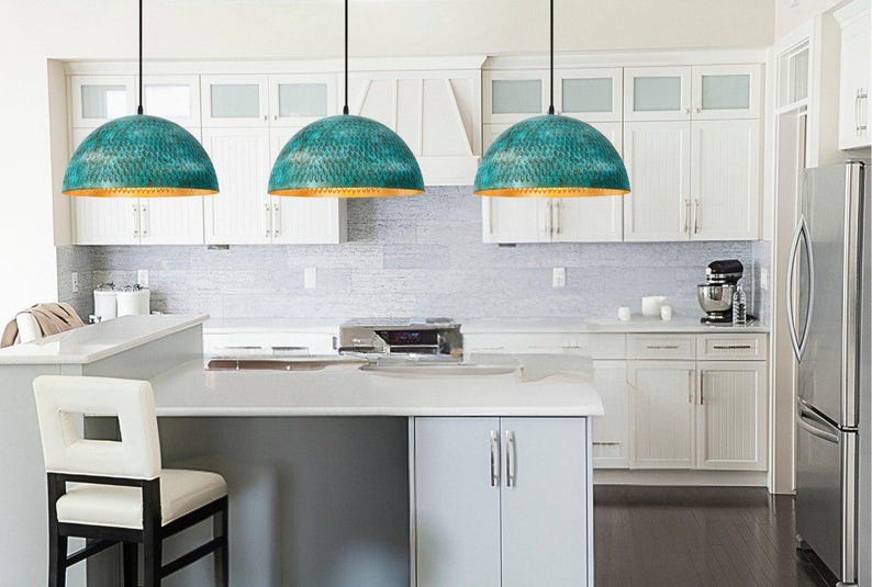 This elegant copper patina pendant light is a perfect addition to any kitchen or dining area, casting a warm, inviting glow over your space. Its combination of vintage aesthetics and the unique, weathered look of patina gives it a timeless charm, blending rustic appeal with modern sophistication. The aged copper finish adds character, making it a versatile decor element for both residential and commercial spaces that embrace both classic and contemporary styles.