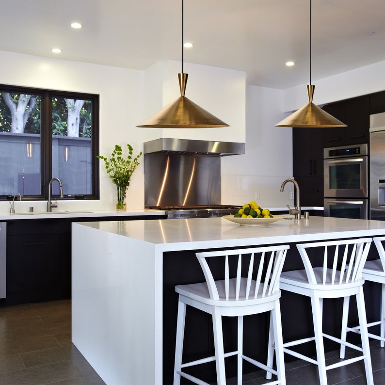 The pendant lamp shade is meticulously handcrafted brass, giving it a unique texture and design.