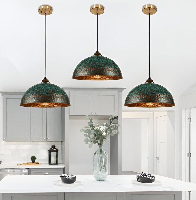 Set of 3 Green patina copper dome pendant light-oxidized turquoise patina with copper interior -modern kitchen island - vintage hanging lamp