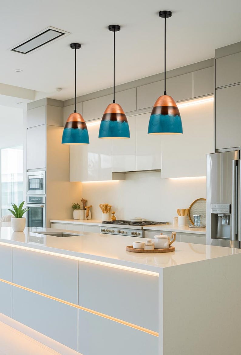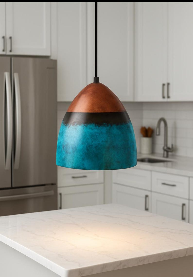 Enhance your kitchen or dining area with this elegant copper patina pendant light, designed to cast a cozy, inviting glow over your island or table. This hanging fixture combines the allure of vintage aesthetics with the distinctive weathered look of patina, embodying both timeless elegance and rustic charm. The aged copper finish infuses any space with character, making it an ideal decorative element for homes or commercial settings seeking a blend of classic and contemporary styles. Add this pendant light to your decor for an instant infusion of warmth and on-trend sophistication, perfect for this season’s ambiance.