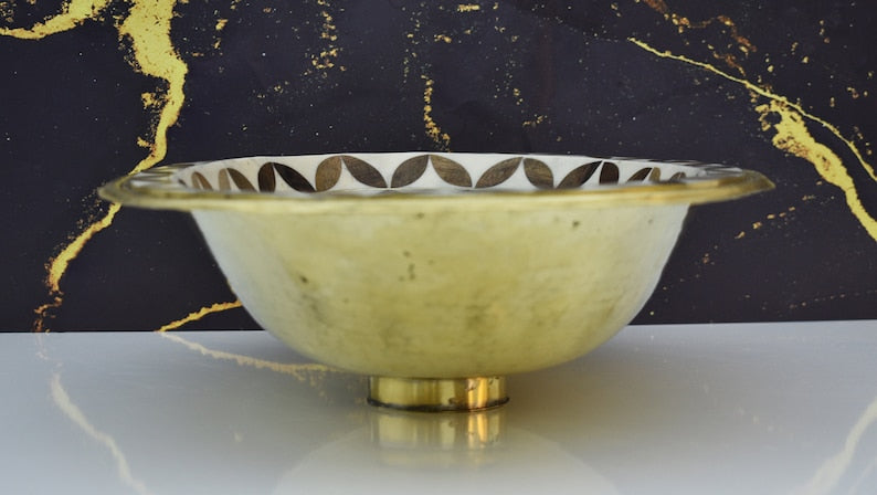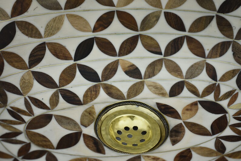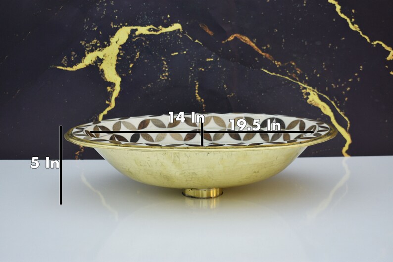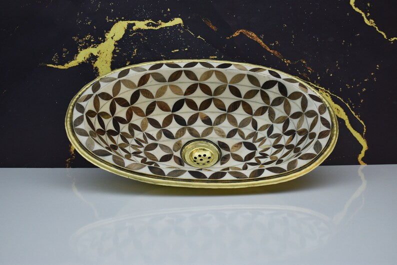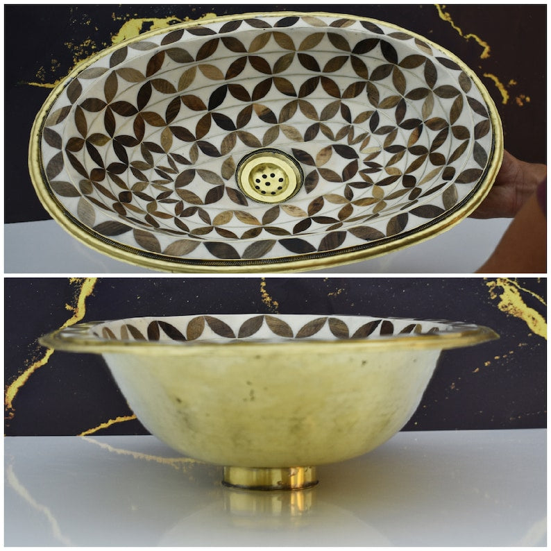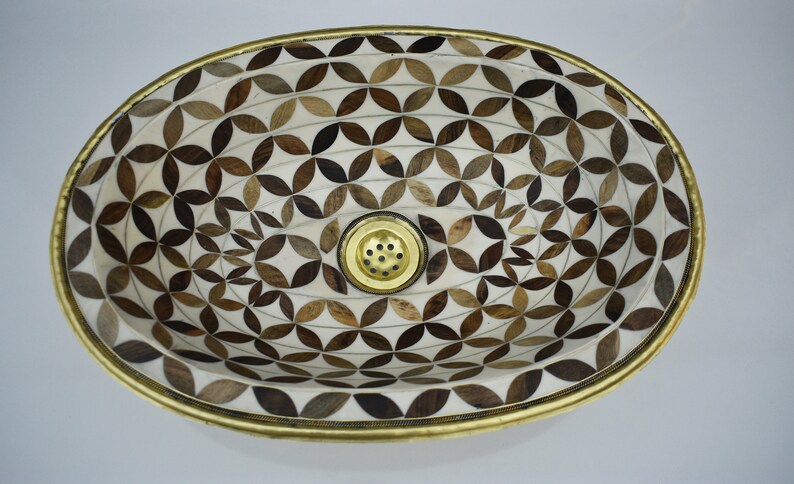 This oval bathroom sink is made of a thick plate of unlacquered solid brass and shaped by the hammer by our master craftsman, Studded with wood and white resin to add luxury to the bowl sink, It gives a touch of Moroccan and Andalusian style to your bathroom.
