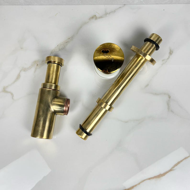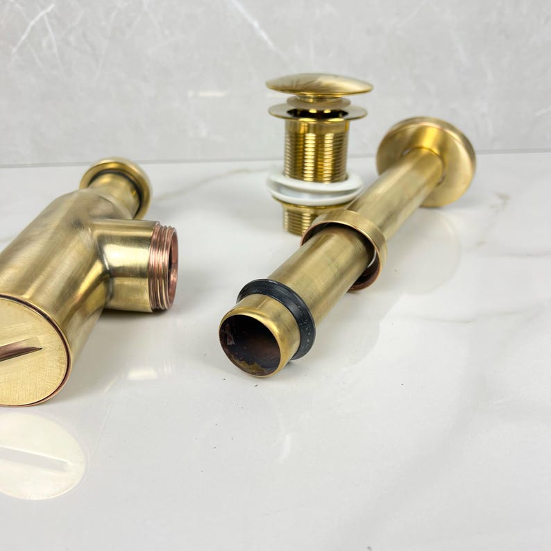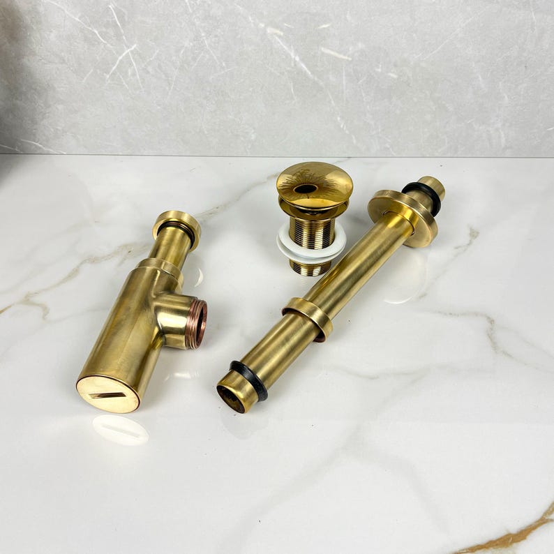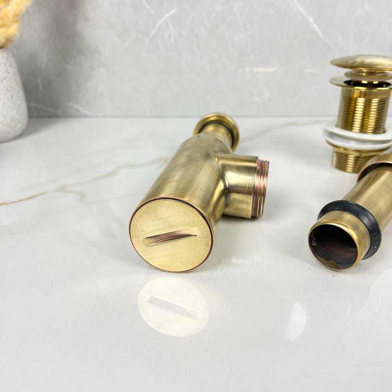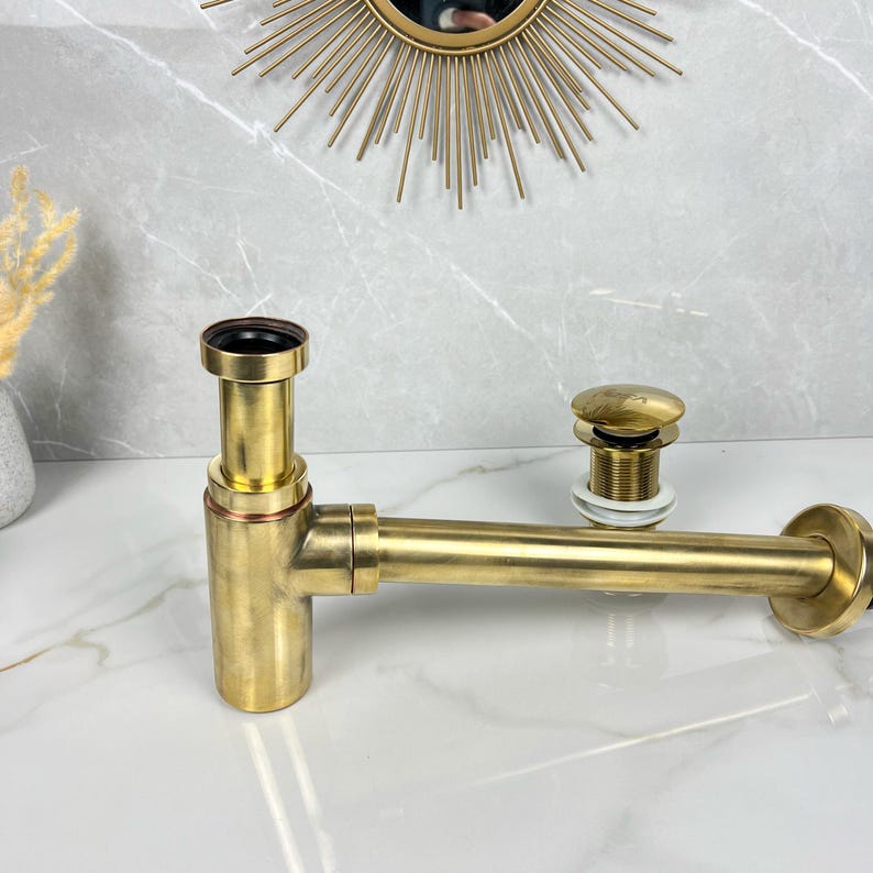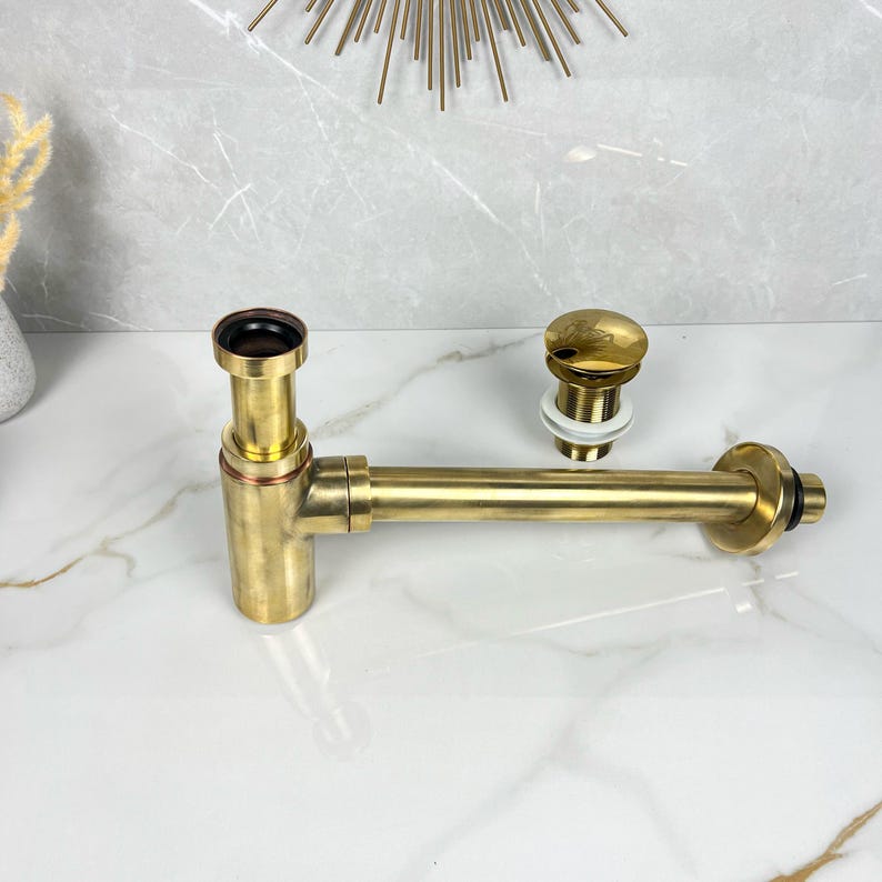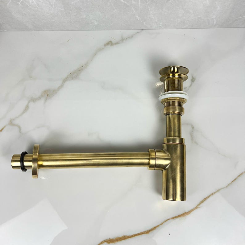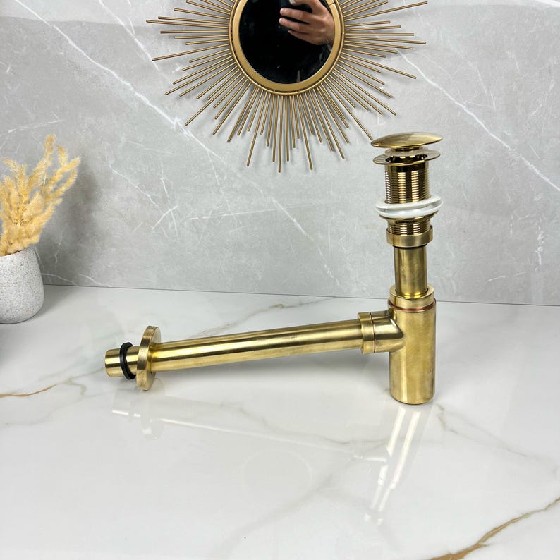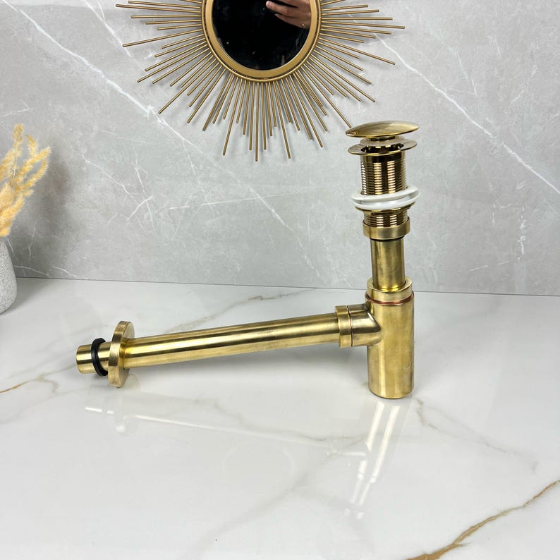 Add a touch of elegance to your bathroom or kitchen with our Solid Brass P-trap with Push-up Drain, crafted with precision to ensure durability and seamless functionality. This high-quality brass component ages beautifully, developing a rich patina that enhances its vintage appeal over time.