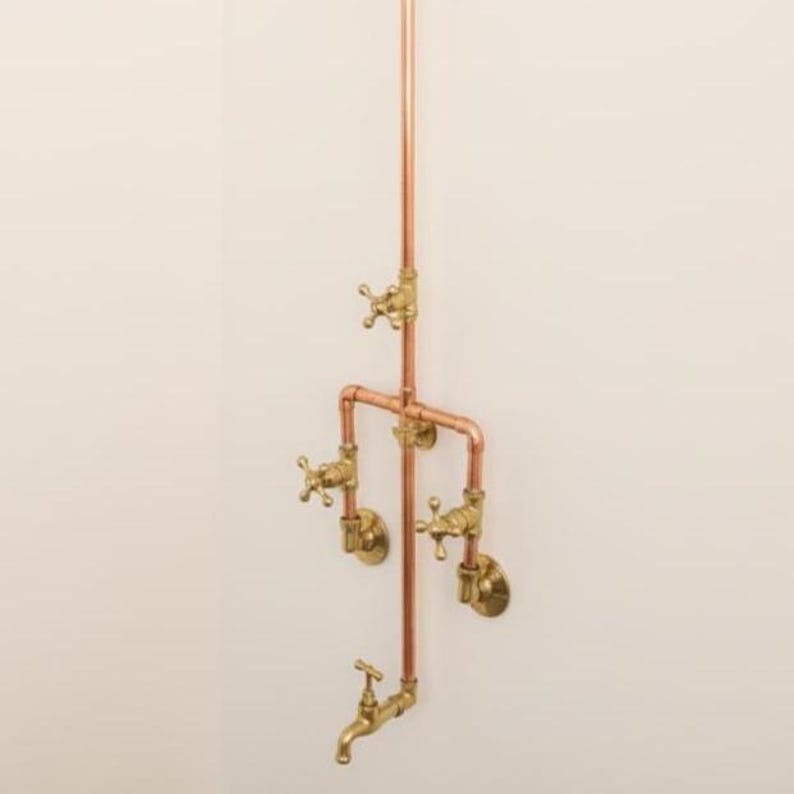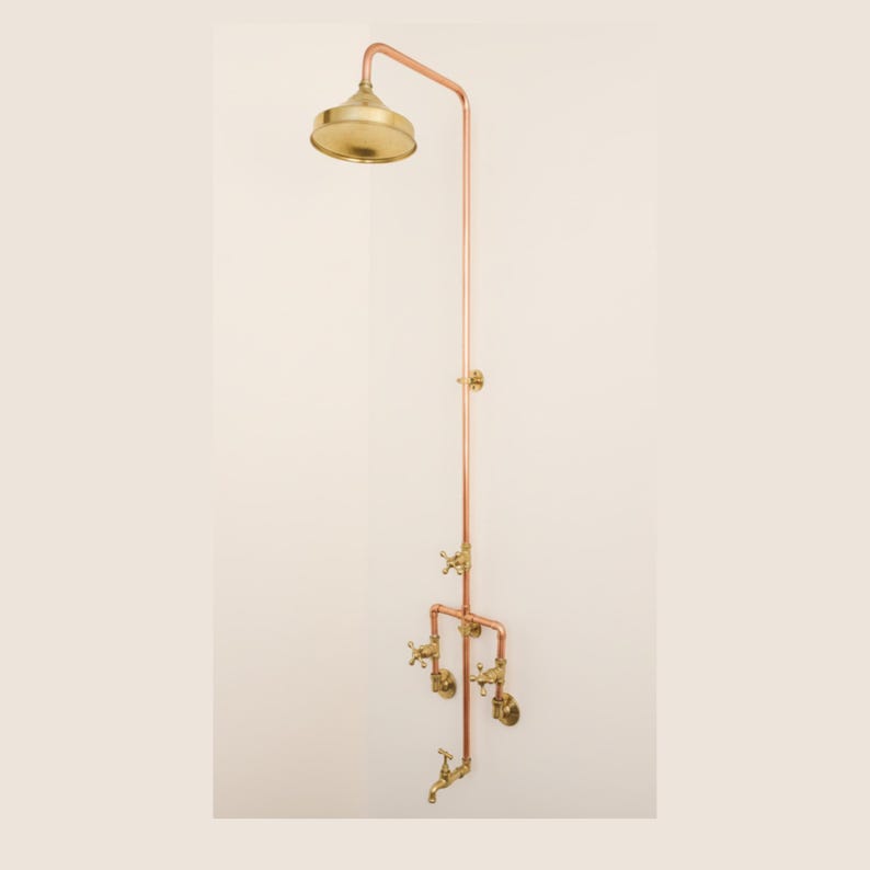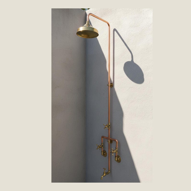 This Outdoor Copper shower system was made of Solid copper, The handles and shower head were made of Unlacquered Brass to give such an amazing look that suits your project Design.